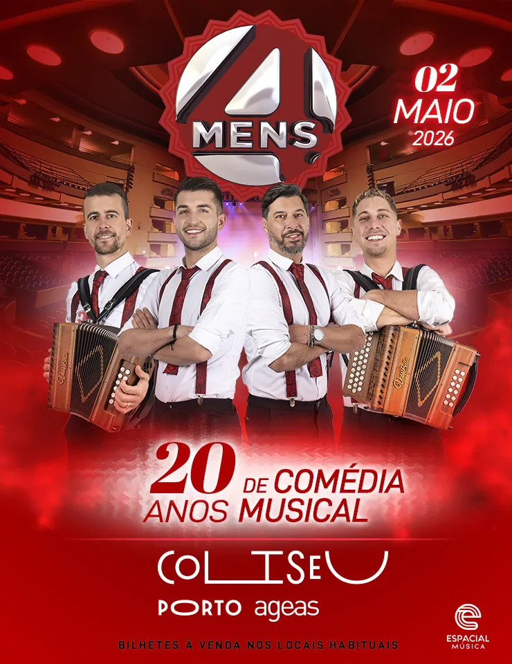 Prepare-se para uma noite inesquecível! No próximo 2 de maio de 2026, às 22h, o Coliseu do Porto Ageas recebe os irreverentes 4Mens para celebrar 20 anos de carreira, num espetáculo único que promete música, humor e emoção com alma portuguesa.