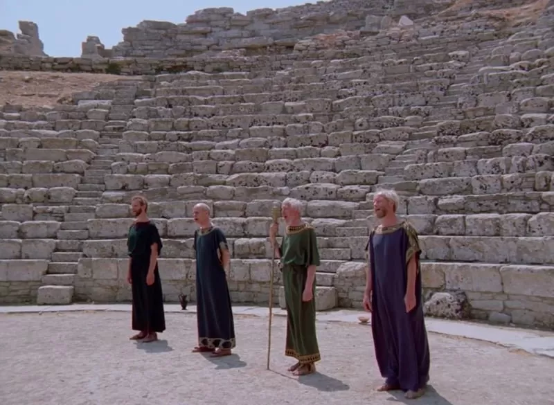Straub-Huillet elevam aqui a sua arqueologia estratigráfica do texto: adaptam Antígona de Sófocles, na tradução de Hölderlin, e tal como Brecht a levou à cena. Apesar de filmado no anfiteatro de Segesta, na Sicília, o filme nunca deixa de unir e comentar as várias temporalidades que o texto apresenta e sugere, sem nunca perder de vista o presente e os seus perigos. “Para nós, um filme é, sobretudo, um encontro com um local. Quando todos estes elementos, o local (espaço), o teatro (ficção), a vida (experiências) se juntam, nasce um filme (tempo)” (D. Huillet).