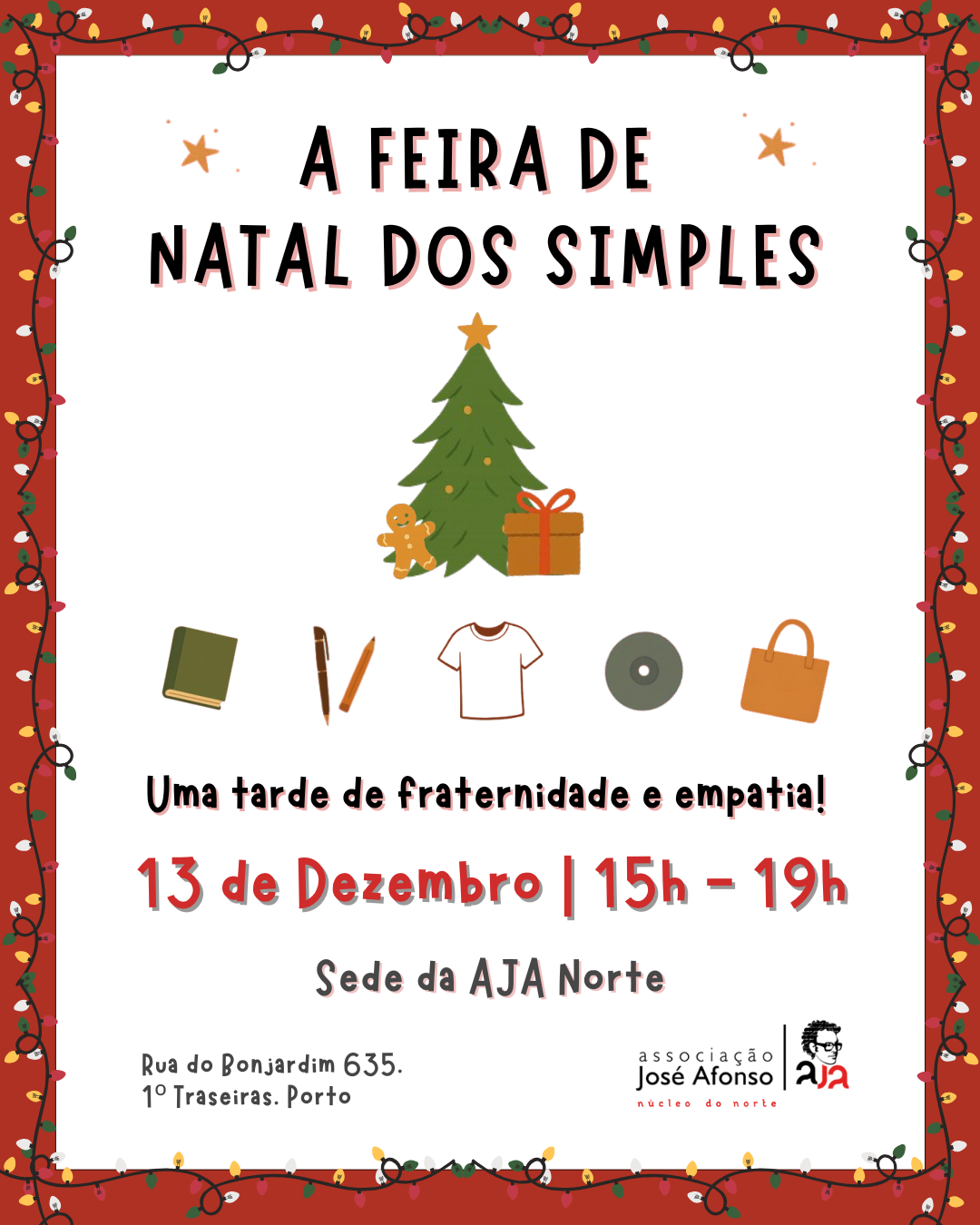 No sΓ‘bado, 13 de dezembro, na sede da AJANorte, entre as 15h e as 19h, vamos organizar βA Feira de Natal dos Simplesβ, onde poderΓ£o encontrar livros, CDβs, sacos, agendas, bolsas, canetas, lΓ‘pis e t-shirts.