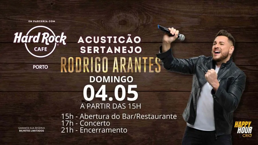Venha curtir o melhor do sertanejo em um formato acústico com Rodrigo Arantes! O evento acontece no Hard Rock Café Porto no dia 4 de maio de 2025, e promete uma tarde de boa música e muita energia!