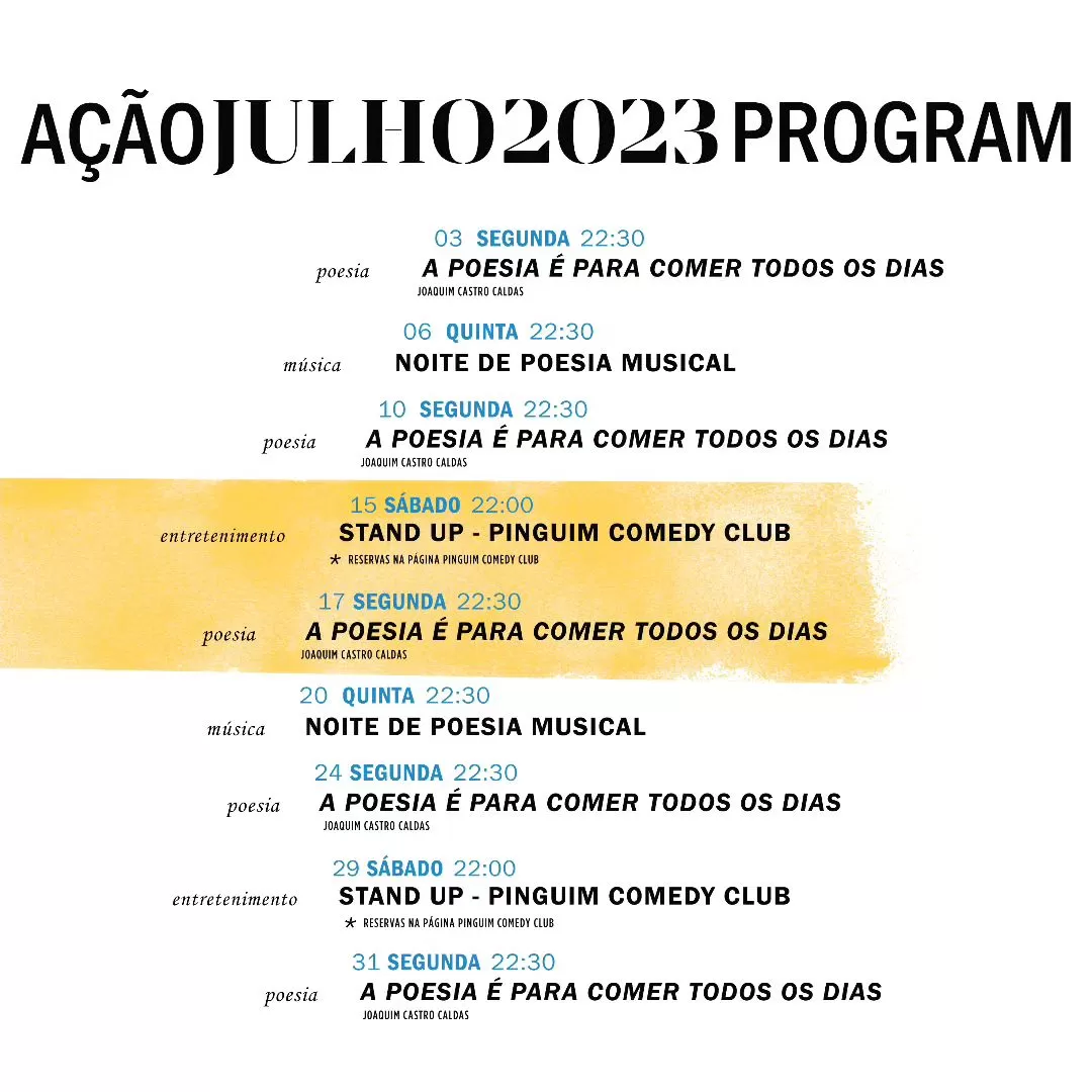 Agenda Julho Pinguim Bar Agenda Julho Pinguim Bar Data 31 Jul 2023 Desde Hora 22:30 Localização Café Pinguim Rua do Belomonte 65 Categorias Concertos / MúsicaEventos ao Fim de semanaLiteraturaStand up Comedy Share this event Newsletter Receba comodamente no seu Email os eventos mais relevantes da cidade do Porto. Deixe este campo vazio se for humano: