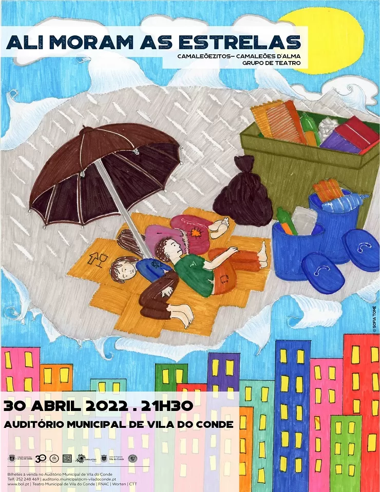 Ali moram as estrelas e o desejo de agarrá-las é uma peça de teatro em estreia, interpretada por pequenos atores da Associação Camaleões d’Alma- Grupo de Teatro, resultado de uma construção criativa: um conjunto de crianças encontra-se num submundo de miséria e expressa livremente o desejo do planeta se tornar um mundo melhor, no esboço da realização dos seus sonhos. A crueldade de ser um sem abrigo, acompanha a realidade de um submundo onde simples gotas de chuva são saboreadas através de uma viagem entre as nuvens ou do encontro com pequenos objetos como uma moeda, uns binóculos, um velho guarda chuva…tudo lhes dá asas para voar e viver o sonho na liberdade para sentir, rir, chorar, dançar, cantar, partilhar… e a esperança ao fazerem-no é um direito à igualdade que ninguém lhes pode roubar: o direito à VIDA, a ser FELIZ!