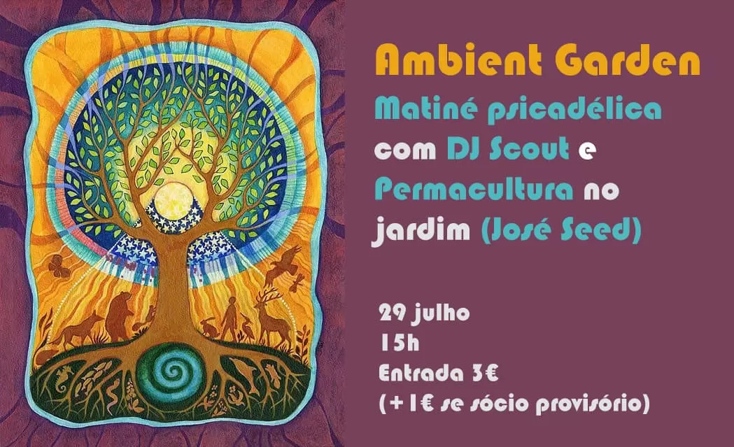 Ambient Garden é uma proposta de uma tarde bem animada, um arraial psicadélico aos comandos de DJ Scout, com a possibilidade de cuidar do jardim e da terra, com belas partilhas e práticas de Permacultura (com José Seed).