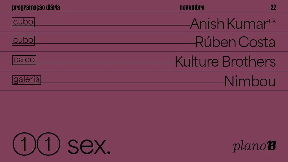 Anish Kumar, Rúben Costa, Kulture Brothers, Nimbou Anish Kumar, Rúben Costa, Kulture Brothers, Nimbou Data 11 Nov 2022 Desde Hora 22:00 Localização Plano B Rua Cândido dos Reis nº30 4050-150 Porto Website https://agendaculturalporto.org/agenda-plano-b-porto/ Categorias Clubbing | NightlifeConcertos / Música Share this event Newsletter Receba comodamente no seu Email os eventos mais relevantes da cidade do Porto. Deixe este campo vazio se for humano: