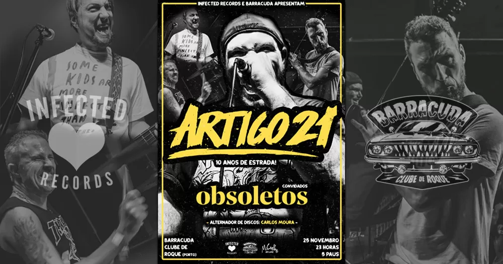 ARTIGO 21 – 10 anos celebrados na estrada! Nascidos em Lisboa, em 2012, os Artigo 21 celebram 10 anos com uma série de concertos à altura da ocasião. Com dois discos na bagagem, várias digressões pelo país, passagem em diversos festivais e suporte a vários nomes internacionais, a banda punk-rock dos subúrbios da capital começou a “agarrar” uma dedicada legião de fãs desde o primeiro concerto, legião essa que foi aumentando muito graças às energéticas e divertidas atuações ao vivo. Com uma formação renovada e a energia e motivação mais elevadas que nunca, cada concerto é uma celebração. Desta vez com o extra do 10º aniversário, onde cada alinhamento será repleto de surpresas. Dia 25 de Novembro a banda regressa ao Porto em nome próprio, numa festa no excelente Barracuda. A primeira parte está a cargo dos locais OBSOLETOS, que abrilhantam a noite com o seu Punk-Hardcore direto e in-your-face, cantado em Português, para fãs de OFF!, Circle Jerks ou Black Flag.