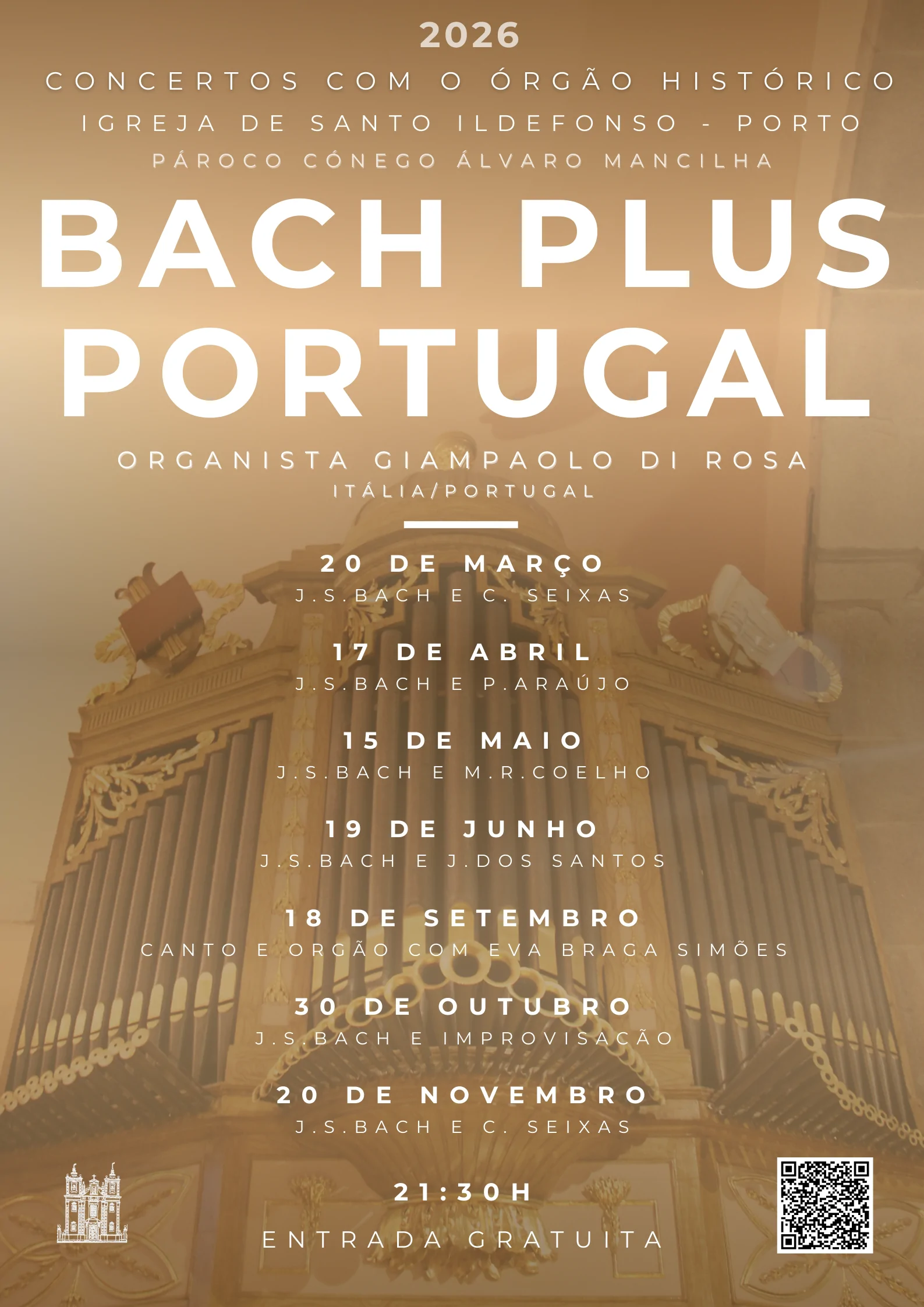 𝐁𝐀𝐂𝐇 𝐏𝐋𝐔𝐒 𝐏𝐎𝐑𝐓𝐔𝐆𝐀𝐋 é um ciclo de 7 concertos pelo Organista Giampaolo di Rosa (Itália/Portugal) que acontecerá sempre 𝐚̀𝐬 𝟐𝟏:𝟑𝟎, nas datas definidas em cartaz, na Igreja de Santo Ildefonso. (Pode ver o cartaz completo no Instagram @igrejadesantoildefonso )