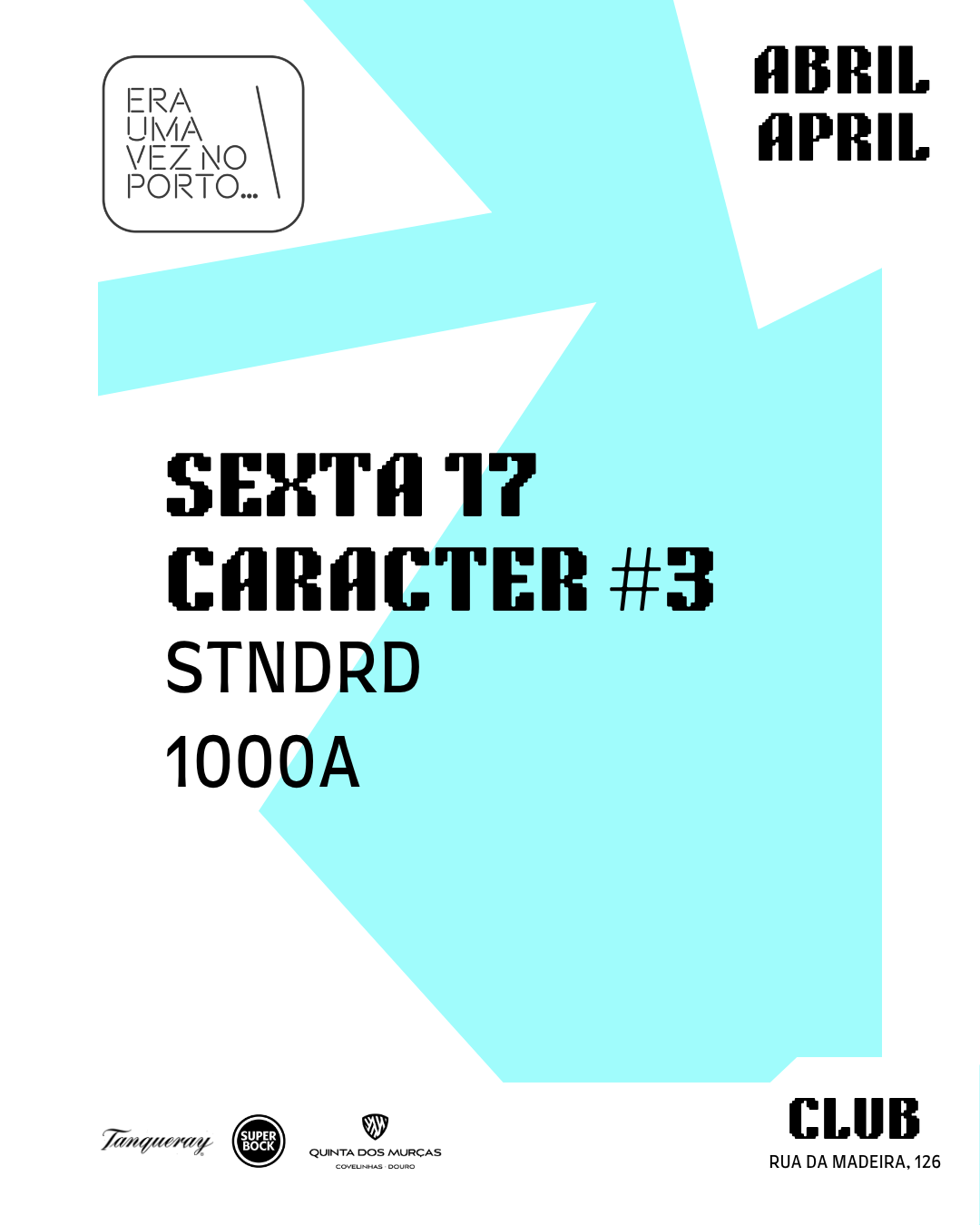 CARACTER #3 … Sexta-feira, 17/04/2026 23h59/6h00 CARACTER #3 🎧 STNDRD 🎧 1000A . . Data 17 - 18 Abr 2026 Desde Hora 23:55 Localização Era uma vez no Porto R. da Madeira 126, 4000-330 Porto Categorias Clubbing | NightlifeEnglish-Friendly EventsEventos ao Fim de semana Share this event Newsletter Receba comodamente no seu Email os eventos mais relevantes da cidade do Porto. Deixe este campo vazio se for humano: