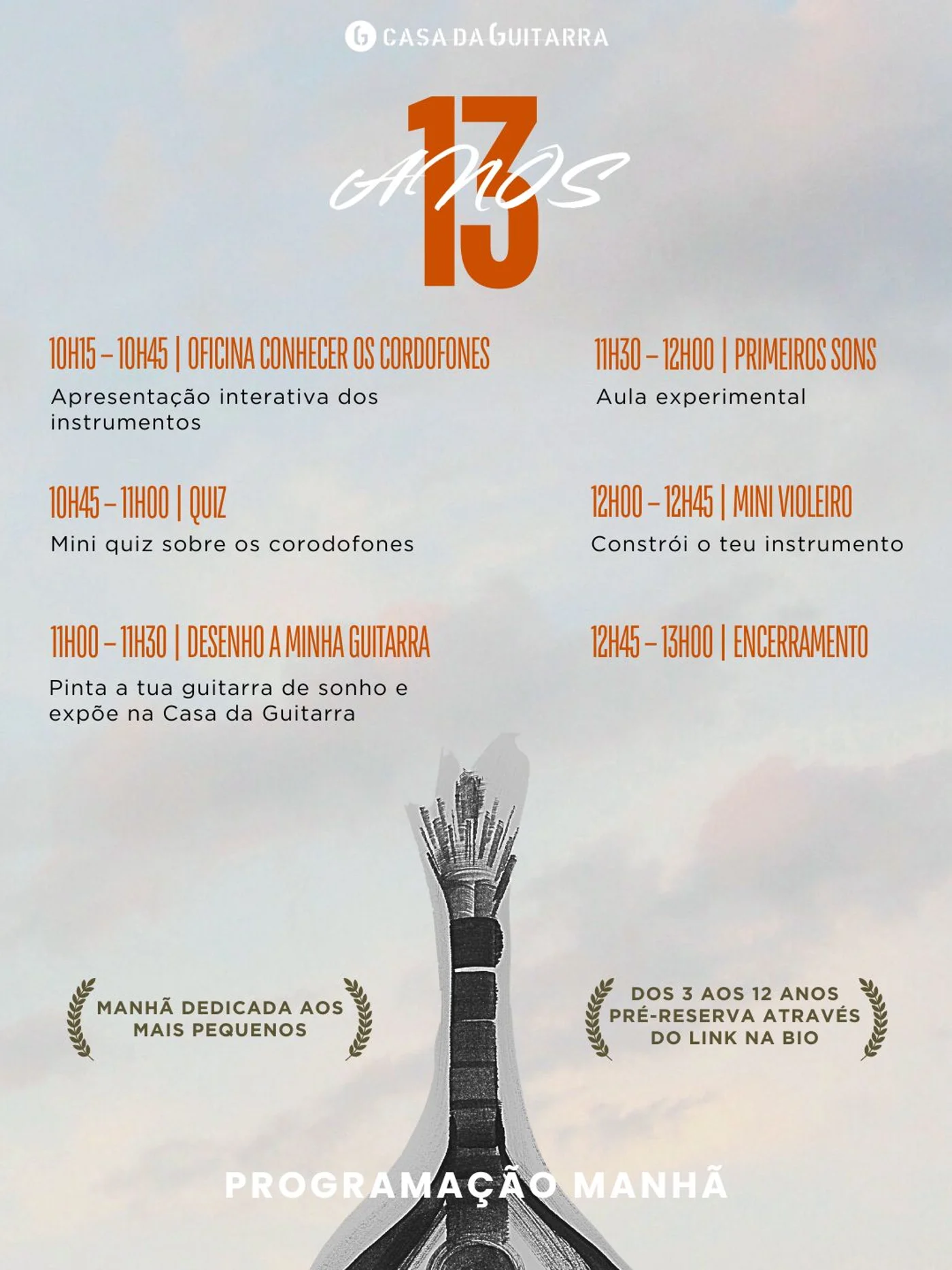 No dia 8 de fevereiro de 2026, a Casa da Guitarra, no Porto, comemora o seu 13.º aniversário com uma manhã especial pensada para os mais novos. A iniciativa Manhã para Crianças é dedicada a crianças dos 3 aos 12 anos e propõe um conjunto de atividades lúdicas e educativas que aproximam os mais pequenos do universo dos instrumentos de cordas, através da música, do jogo e da criatividade.