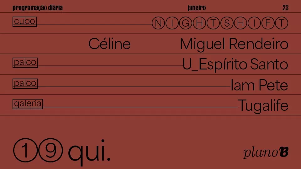 Céline, Miguel Rendeiro, U_Espírito Santo, Iam Pete, Tugalife Céline, Miguel Rendeiro, U_Espírito Santo, Iam Pete, Tugalife Data 19 Jan 2023 Desde Hora 22:00 Localização Plano B Rua Cândido dos Reis nº30 4050-150 Porto Website https://agendaculturalporto.org/agenda-plano-b-porto/ Categorias Clubbing | NightlifeConcertos / Música Share this event Newsletter Receba comodamente no seu Email os eventos mais relevantes da cidade do Porto. Deixe este campo vazio se for humano: