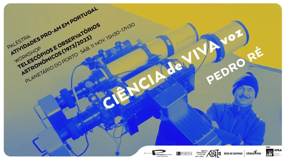 A ciência não existe sem cientistas por isso é preciso dar-lhes VOZ. Pedro Ré, professor catedrático, biólogo e astrónomo amador, foi convidado para falar da importância da atividade Pro-am (colaboração entre astrónomos amadores e profissionais) em Portugal e da evolução dos telescópios – apresentado alguns instrumentos históricos e outros muito atuais.