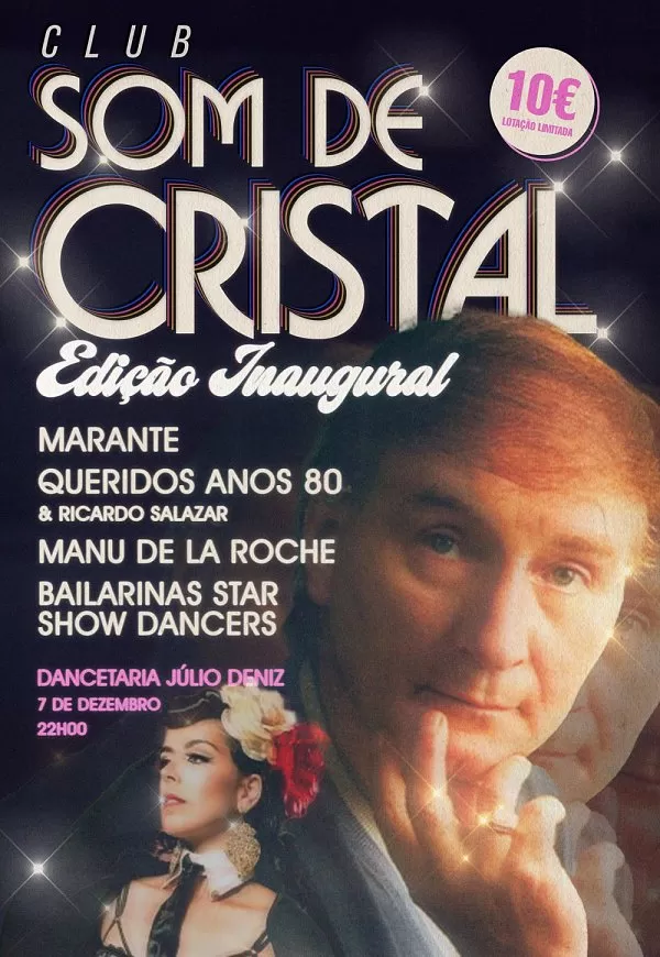 Dos criadores de Piquenique Dançante Sobre a Relva, encontro de famílias, cestos e toalhas ao ar livre e no esplendoroso sol, Club Som de Cristal é para divorciados e para quem se quer divorciar, amar e ser amado num one night stand, beber do sapato de uma stripper, ser sugar daddy, MILF iniciadora ou apenas divertir-se na edição inaugural da festa que vai ser lendária, num sítio mítico como a Danceteria Júlio Deniz, Salão de Baile!