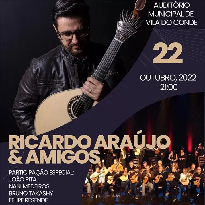 Brasileiro, descendente de Portugueses, Ricardo Araújo herdou alma lusa, corre lhe nas veias a paixão pela guitarra Portuguesa e acabou se tornando referência no instrumento com concertos e alunos por todo o mundo. Em Vila do Conde dia 22 de outubro, Ricardo Araújo apresentará um concerto recebendo 2 virtuosos da viola Caipira no Brasil, Bruno Takashy e Felipe Resende. Um encontro inédito da guitarra portuguesa com a viola caipira. Teremos também a presença do viola João Pita e a renomada cantora Nani Medeiros. Ricardo Araújo dará oportunidade de seus alunos se apresentarem a publico, juntando alguns amigos numa noite única, brindando à amizade e tradição. Teremos a presença de uma das maiores orquestras de guitarra portuguesa da atualidade.