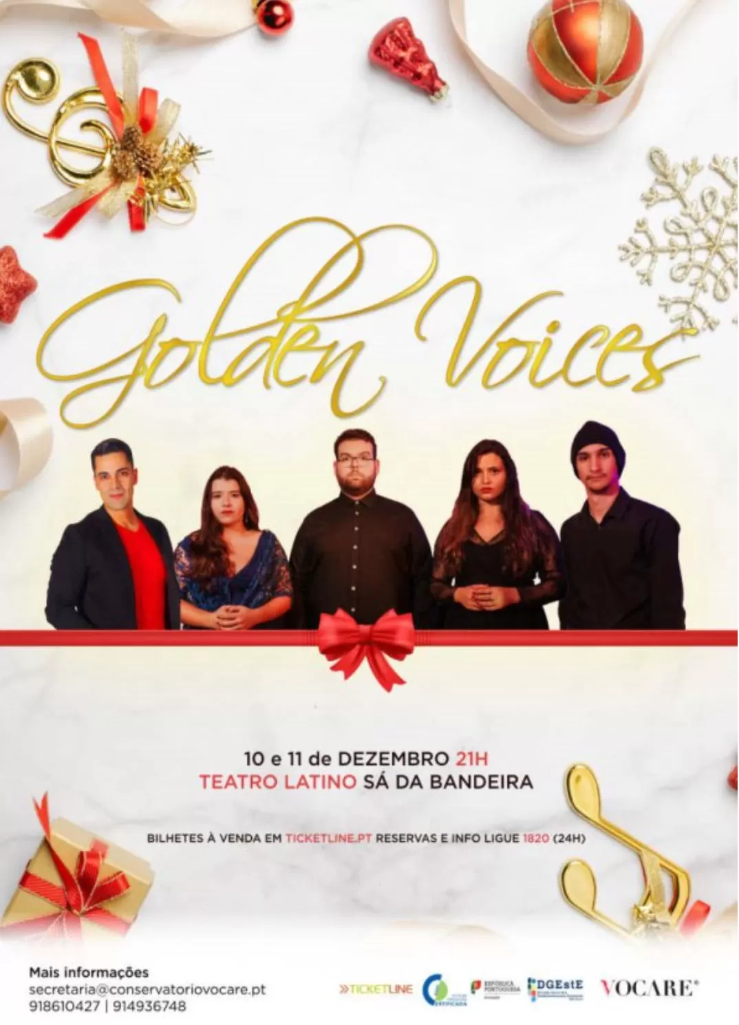 O Natal está próximo e, com ele, a magia dos Golden Voices! Vozes que eternizam momentos, com talento e alma, em um reportório a 5 vozes, juntamente ao encantador piano de Marta Silva e o Violoncelo de Cecília Reis. O desenho de luz fica ao encargo de Pico Moreira, e a dramaturgia de João Miguel Mota, está uma pequena caixa surpresa, e nela, o amor e a sonoridade que nos iluminam. Neste primeiro Natal após uma época que precisamos tanto de um acalento, seremos presenteados pelo talento e o poder transformador da esperança em um novo tempo. Será um espetáculo prazeroso e imperdível; reserve já o seu bilhete de viagem às vozes que nos fazem sonhar!