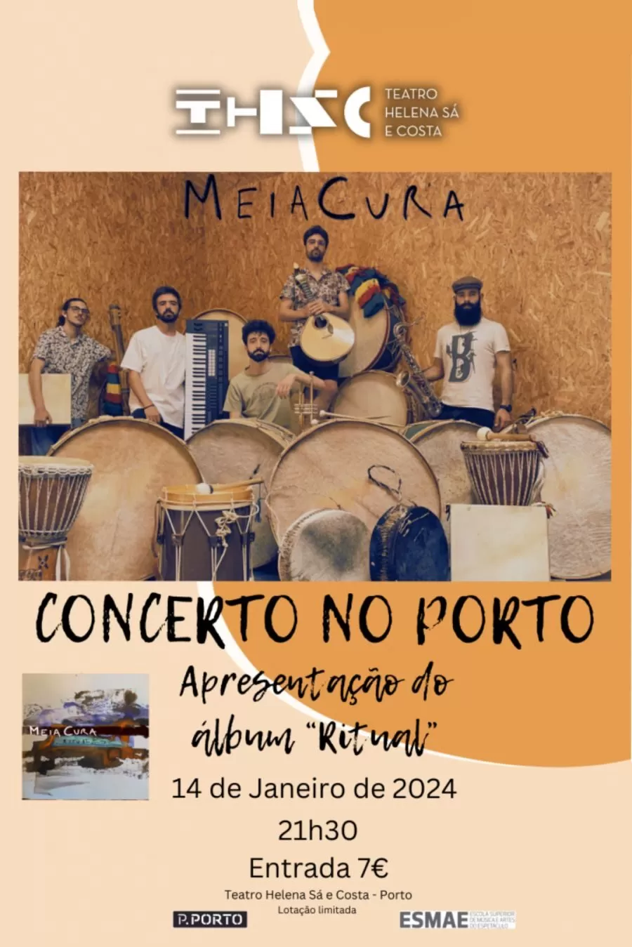 Em 14 de janeiro de 2024, o Teatro Helena Sá e Costa, no Porto, Portugal, apresenta o espetáculo ‘Ritual’ com a banda MeiaCura. Este evento musical é uma jornada espiritual e sonora que explora influências que vão do tradicional português ao jazz fusão, dance music, trance, funk e world music. MeiaCura, uma banda formada por cinco talentosos músicos, uniu-se para criar o álbum ‘Ritual’ e oferece uma experiência musical que transcende as fronteiras da cura contínua e regeneradora. Venha fazer parte dessa experiência transformadora e celebre a música, a cultura e a busca pela cura numa noite inesquecível no Teatro Helena Sá e Costa, no Porto.