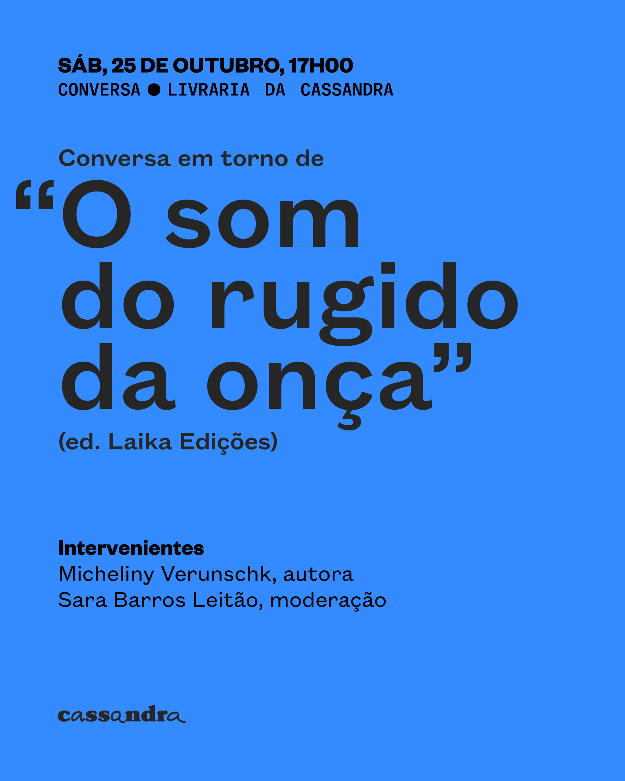 A Livraria da Cassandra acolhe, em parceria com a Laika Edições, uma conversa em torno de “O som do rugido da onça”, de Micheliny Verunschk, com a presença da própria autora e moderação de Sara Barros Leitão.