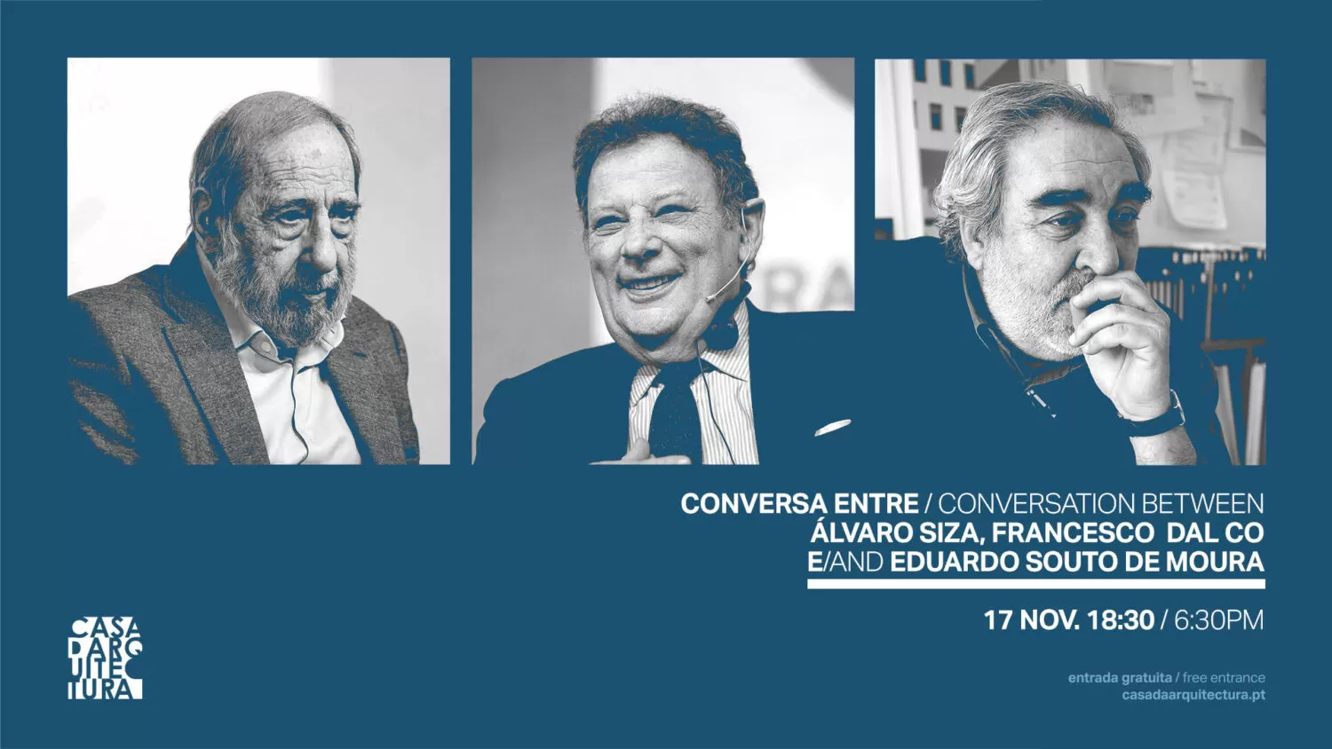 The three Honorary Members of Casa da Arquitectura, Álvaro Siza, Francesco Dal Co and Eduardo Souto de Moura, will be in conversation on Wednesday, November 17, at 6:30 pm, after the Honorary Member Award Ceremony title to Siza and Dal Co.