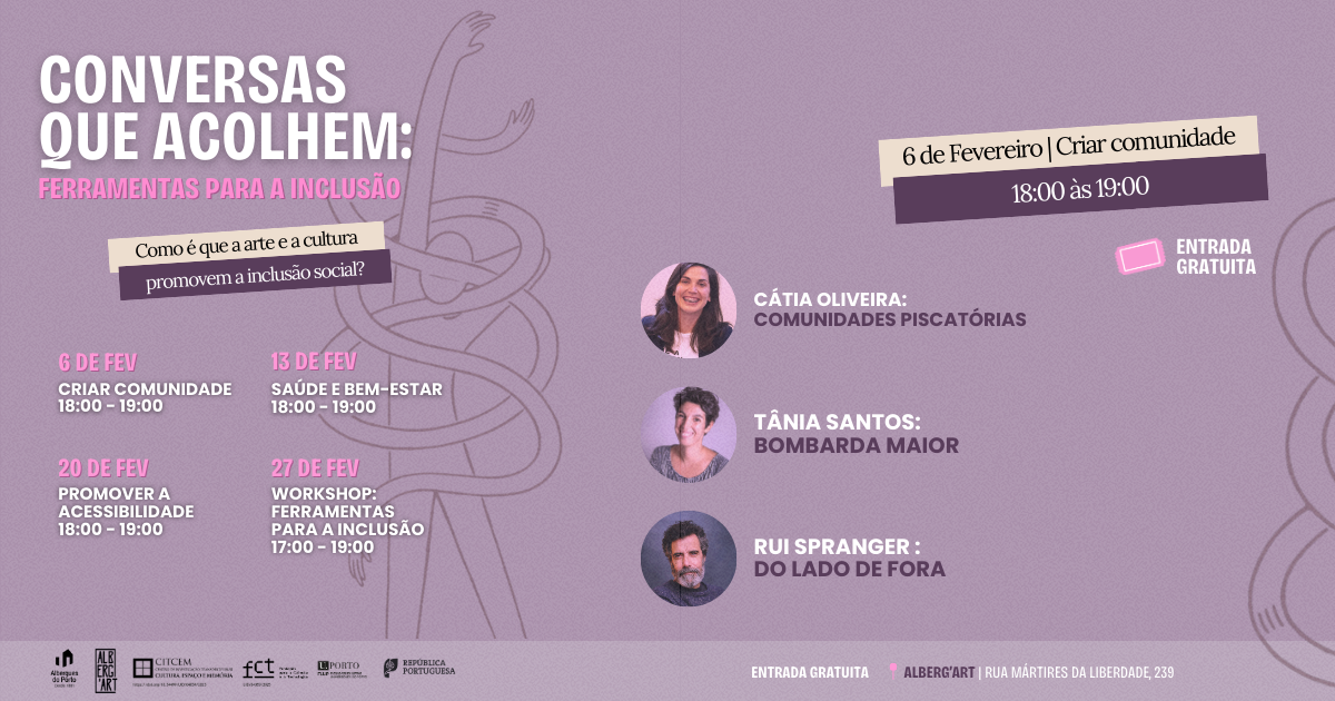 Ao longo do mês de fevereiro, a Alberg’Art – a galeria afeta aos Albergues do Porto, uma IPSS que acolhe pessoas em situação de sem-abrigo – vai organizar o ciclo de “Conversas que acolhem: Ferramentas para a inclusão”, em parceria com o CITCEM-FLUP e graças ao apoio da FCT.