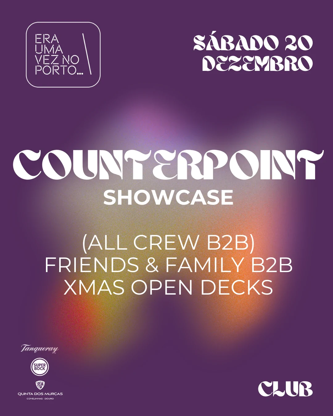 COUNTERPOINT SHOWCASE … Sábado, 20|12|2025 COUNTERPOINT SHOWCASE 🎧 All Crew B2B 🎧 Friends & Family B2B 🎧 X-Mas Open Decks . . + Adicionar ao Google Calendar Data 20 - 21 Dez 2025 Hora 23:55 - 6:00 Localização Era uma vez no Porto R. da Madeira 126, 4000-330 Porto Categorias Clubbing | NightlifeEnglish-Friendly EventsEventos ao Fim de semana Share this event Newsletter Receba comodamente no seu Email os eventos mais relevantes da cidade do Porto. Deixe este campo vazio se for humano:
