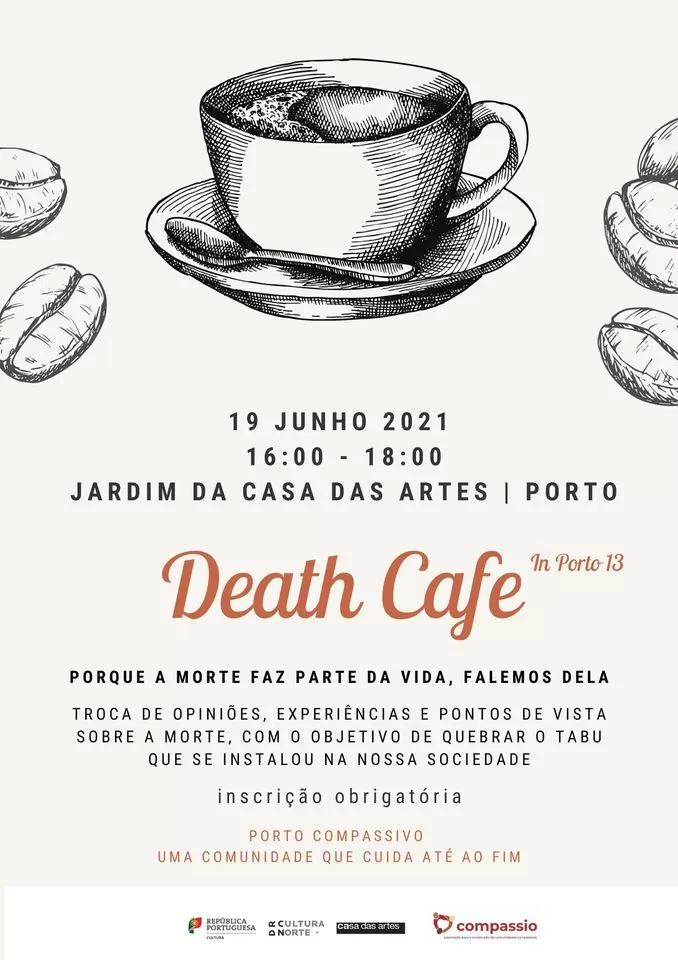 Integrado no movimento internacional Death Cafe, oferecemos uma tertúlia num ambiente descontraído para falar da morte sem tabus. Os Death Café servem para a troca de opiniões, experiências e pontos de vista sobre a morte, com o objetivo de quebrar o tabu que se instalou na nossa sociedade.