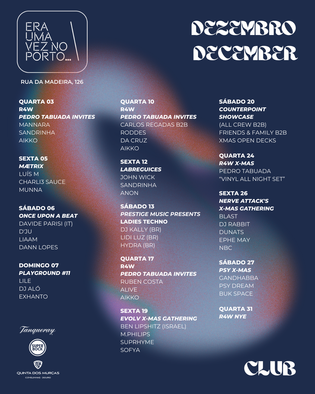 Dezembro @ Era um vez no Porto … Dezembro / December @era_uma_vez_no_porto . . + Adicionar ao Google Calendar Data 03 - 31 Dez 2025 Hora 0:00 - 23:55 Localização Era uma vez no Porto R. da Madeira 126, 4000-330 Porto Categorias Clubbing | NightlifeConcertos / MúsicaEnglish-Friendly EventsEventos ao Fim de semana Share this event Newsletter Receba comodamente no seu Email os eventos mais relevantes da cidade do Porto. Deixe este campo vazio se for humano: