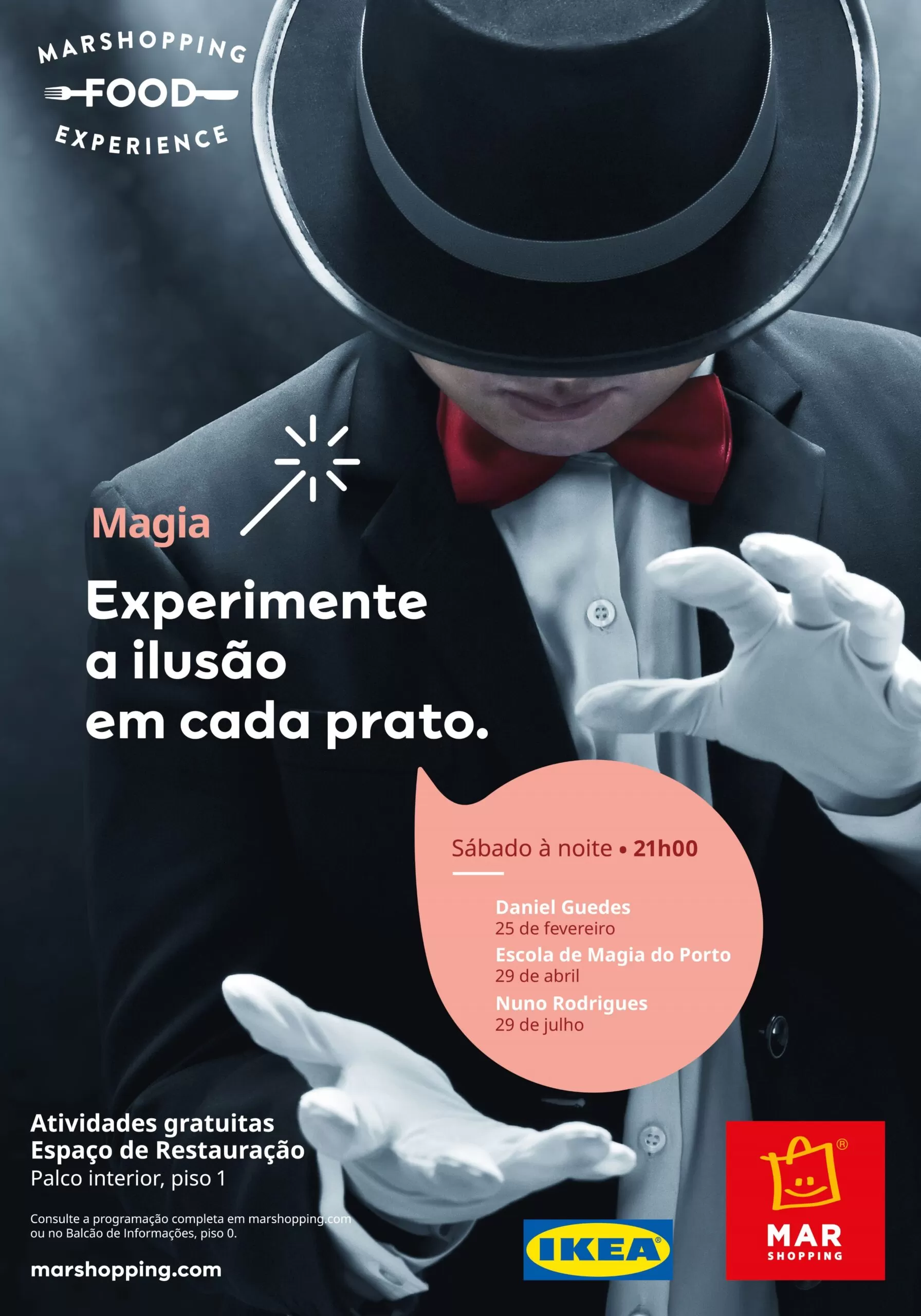 Continua a programação cultural e de lazer gratuita MAR Shopping Food Experience, que serve, no palco do espaço de restauração do MAR Shopping Matosinhos (piso 1), mais uma noite de magia no sábado, 29 de abril, às 21h00. O palco recebe uma atuação de ilusionismo saída da cartola da Escola de Magia do Porto, uma das mais conceituadas do país.