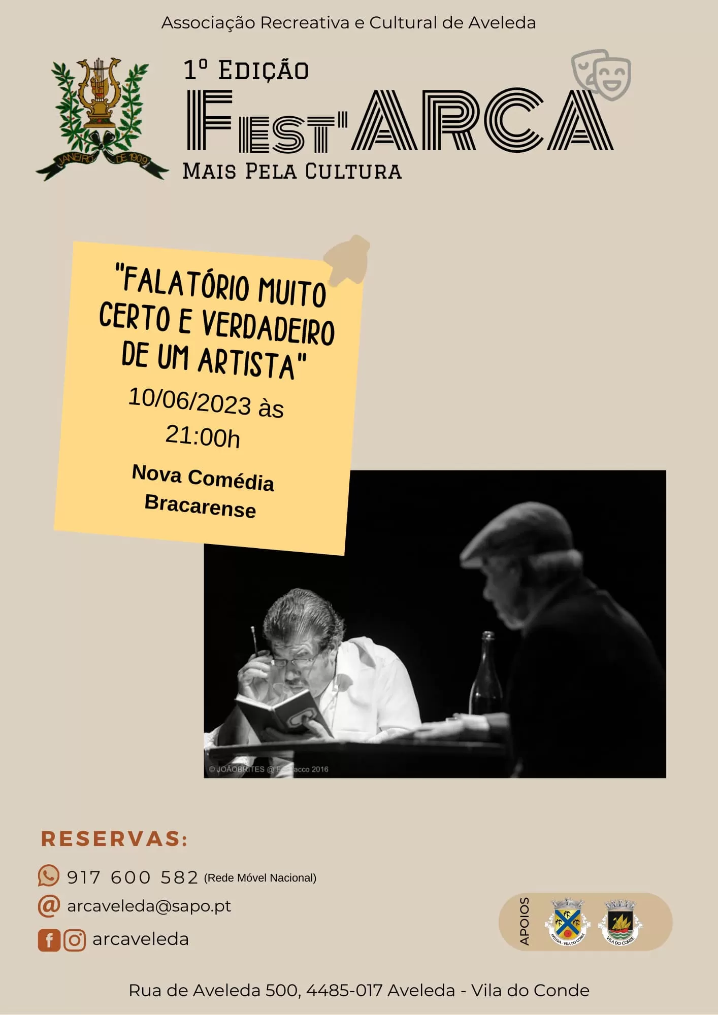 FALATÓRIO MUITO CERTO E VERDADEIRO DE UM ARTISTA 1ª Edição Fest’ARCA – Festival de Teatro 10 Junho | 21:00h | Teatro de Aveleda “Falatório muito certo e verdadeiro de um artista” apresentação de Nova Comédia Bracarense Entrada mediante Bilhete | Para Reservas Contactar: 917 600 582 arcaveleda@sapo.pt Data 10 Jun 2023 Desde Hora 21:00 - 22:00 Localização Teatro de Aveleda R. da Aveleda 500, 4485-017 Aveleda Categorias Eventos ao Fim de semanaTeatro Share this event Newsletter Receba comodamente no seu Email os eventos mais relevantes da cidade do Porto. Deixe este campo vazio se for humano: