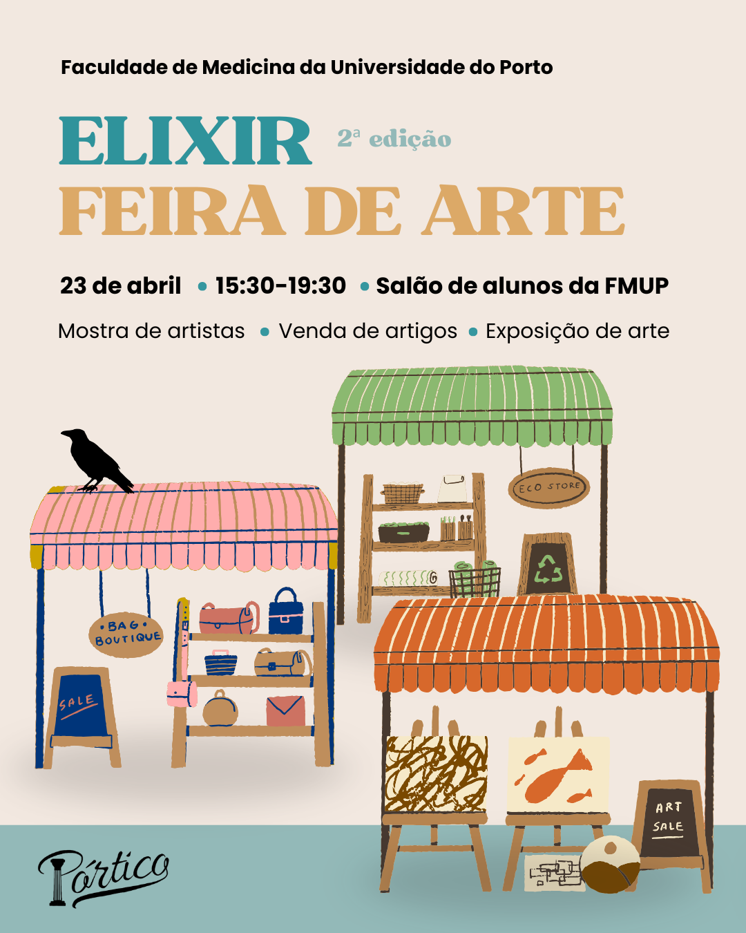 O Pórtico, grupo afiliado da AEFMUP, realiza já no dia 23 de abril de 2026 a segunda edição da Feira de Arte Elixir. O Pórtico é um grupo com o objetivo de juntar a arte e a cultura à medicina. A nossa feira de artesanato tem como objetivo apoiar small business e dar palco a novos artistas. Assim sendo, dia 23 de abril das 15:30 até às 19:30 junta-te a nós na Faculdade de Medicina da Universidade do Porto, no salão de alunos da aefmup.