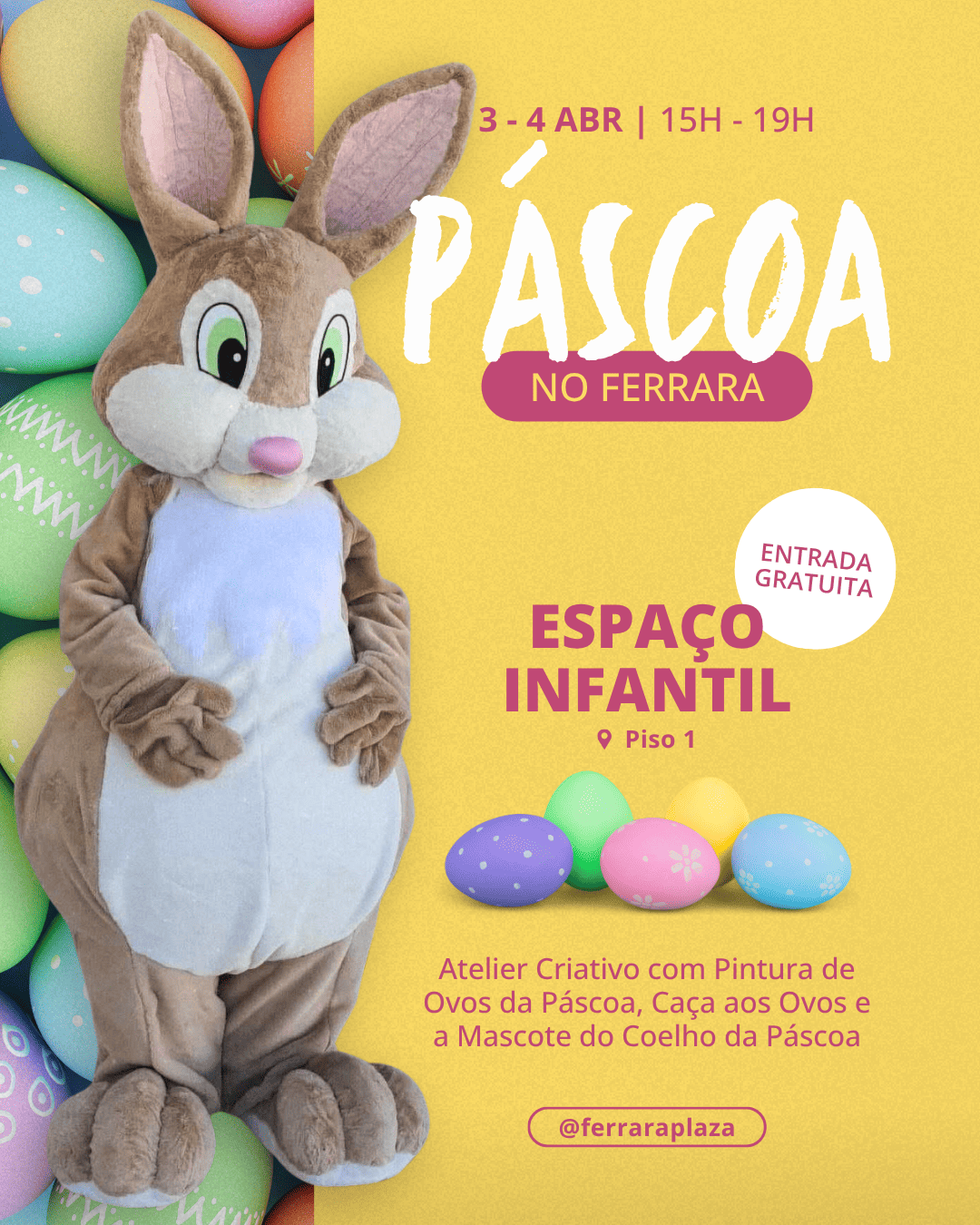 Com esta iniciativa, o Ferrara Plaza reforça o seu compromisso em proporcionar experiências diferenciadoras e momentos especiais aos seus visitantes, celebrando a Páscoa com um ambiente festivo, familiar e acolhedor.