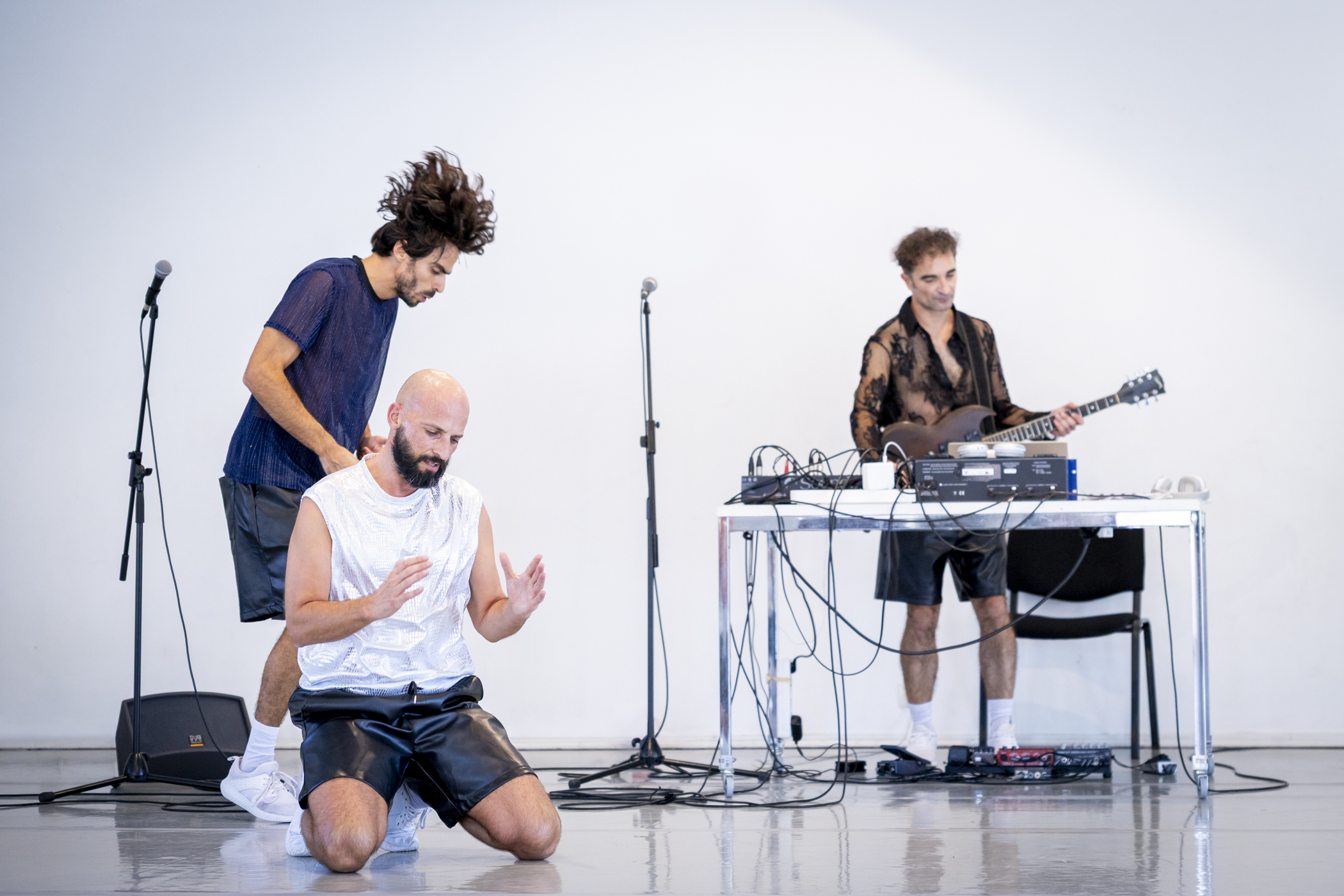 “Um abraço ou um beijinho” de Ricardo Machado e João Carvalho, propõe uma viagem imersiva pelo fenómeno cultural da música “Pimba”, utilizando-o como matéria crítica e sensível, questionando as ideias de masculinidade que o atravessam. Três artistas com percursos distintos – homens cisgénero, brancos, europeus e de diferentes gerações – colocam os seus corpos como matéria de análise e confronto, utilizando a dança, o texto e a música para questionar e expandir os significados do masculino.