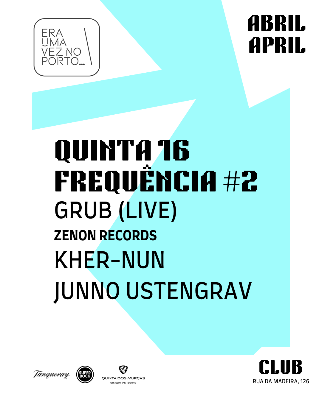 Frequência #2 … Quinta-feira, 16/04/2026 23h59/6h00 Frequência #2 🎧 GRUB (live) Zenon records 🎧 KHER-NUN 🎧 JUNNO USTENGRAV . . Data 16 - 17 Abr 2026 Desde Hora 23:55 - 6:00 Localização Era uma vez no Porto R. da Madeira 126, 4000-330 Porto Categorias Clubbing | NightlifeEnglish-Friendly Events Share this event Newsletter Receba comodamente no seu Email os eventos mais relevantes da cidade do Porto. Deixe este campo vazio se for humano: