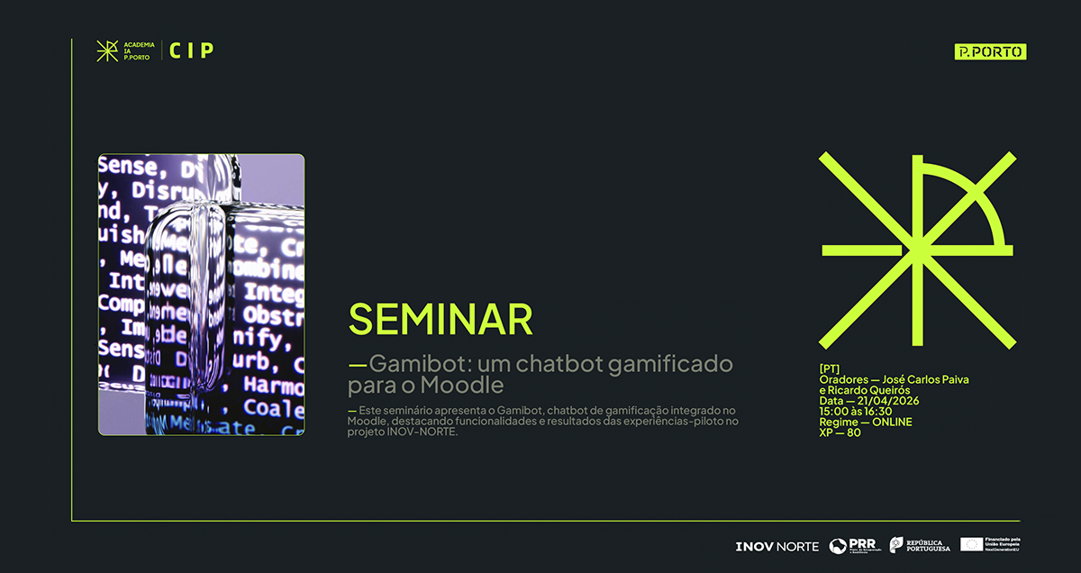 O Centro de Inovação Pedagógica (CIP) do Politécnico do Porto promove um novo Flash Seminar dedicado ao Gamibot, uma solução que integra inteligência artificial e gamificação no Moodle para reforçar a aprendizagem e o envolvimento dos estudantes.