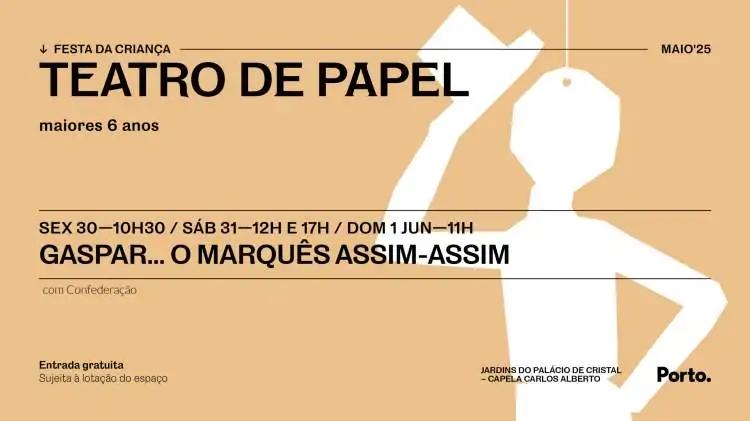 No próximo sábado, 31 de maio de 2025, às 12h00 e às 17h00, os Jardins do Palácio de Cristal, no Porto, recebem o espetáculo infantil “Gaspar… O Marquês Assim-Assim”, apresentado em quatro sessões entre os dias 30 de maio e 1 de junho. A entrada é livre, sujeita à lotação.