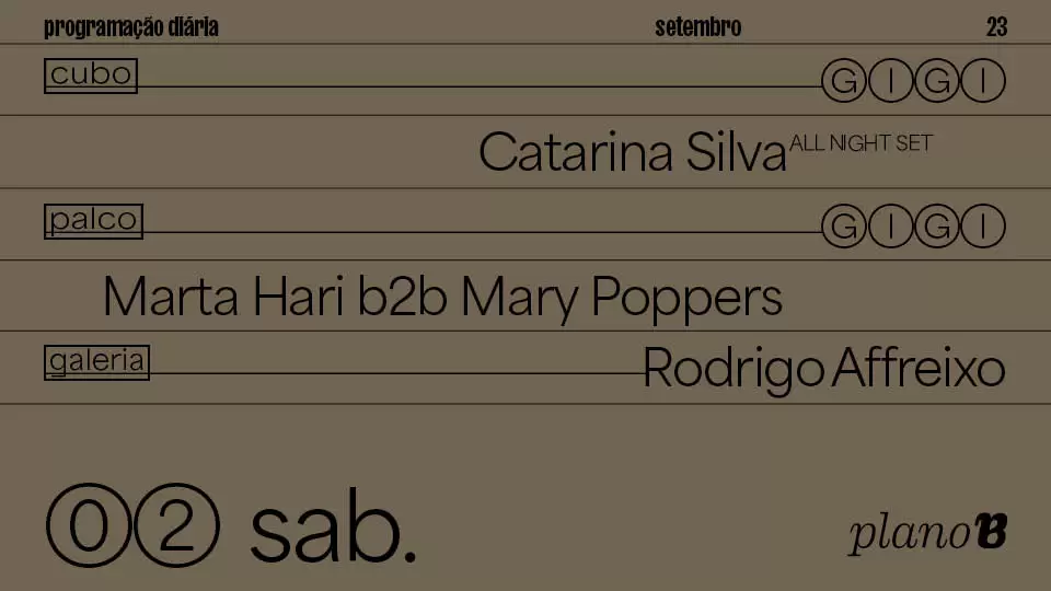 GIGI – Plano B Catarina Silva Marta Hari b2b Mary Poppers Rodrigo Affreixo GIGI – Plano B Data 02 Set 2023 Desde Hora 22:00 Localização Plano B Rua Cândido dos Reis nº30 4050-150 Porto Website https://agendaculturalporto.org/agenda-plano-b-porto/ Categorias Clubbing | NightlifeConcertos / MúsicaEventos ao Fim de semana Share this event Newsletter Receba comodamente no seu Email os eventos mais relevantes da cidade do Porto. Deixe este campo vazio se for humano:
