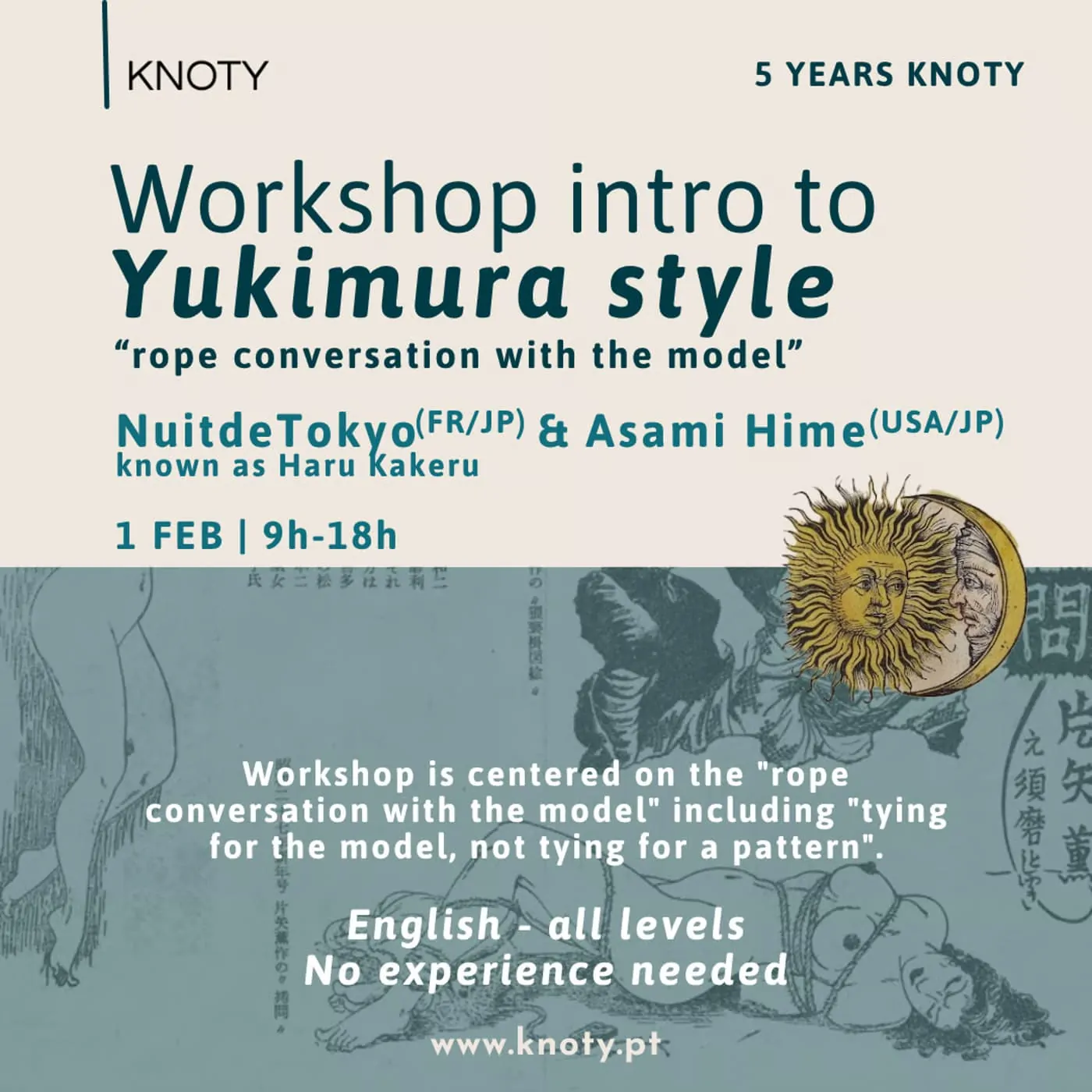 Workshop de nível aberto, destinado a iniciantes absolutos e curiosos, focado no estilo Yukimura de shibari. Inclui técnicas de «conversa com a corda com a modelo», leitura da tensão da corda e do modelo, amarrações eróticas não fotográficas e práticas seguras. Inscrição obrigatória. Bilhetes disponíveis para participantes individuais (Listeners) ou combinados com outros workshops.