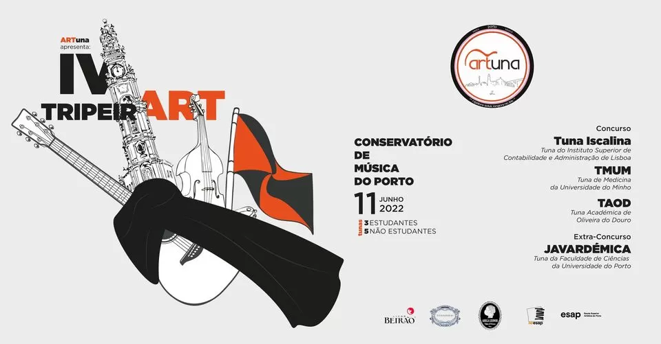 Bem vindos ao IV TripeirART. O TripeirART é o primeiro festival de Tunas Mistas a ser realizado na Cidade do Porto e já vai na IV edição onde vos aguardam muitas surpresas! Dia 11 de Junho de 2022 no Conservatório de Música do Porto às 20h.