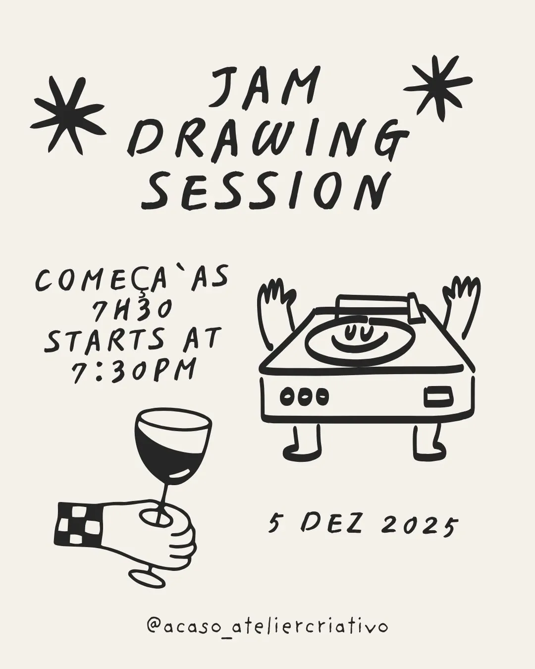 Uma jam session de desenho é como uma improvisação musical, mas feita de traços, cores e gestos. Um encontro aberto, descontraído e cheio de energia criativa, onde cada pessoa traz o seu olhar e o seu estilo para desenhar livremente, em conjunto.