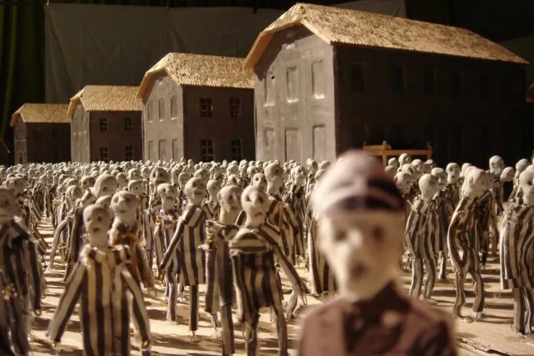 Uma maquete enorme, representando o campo de Auschwitz-Birkenau enche o palco. Casernas sobrelotadas, uma linha de caminho-de-ferro, um portão com as palavras “Arbeit Macht Frei”. Milhares de marionetas de 7 cm, feitas à mão, representam os prisioneiros e os seus carrascos. Três atores dão vida ao campo, usando câmaras em miniatura para filmar os acontecimentos. O público é testemunha do assassínio em massa, cometido numa cidade feita para isso mesmo.