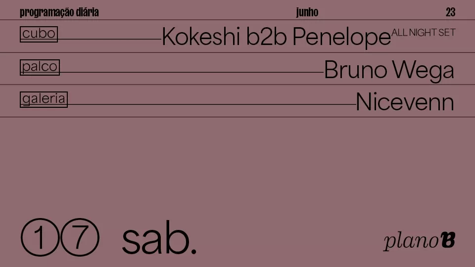 Kokeshi, Penelope, Bruno Wega, Nicevenn – Plano B Kokeshi, Penelope, Bruno Wega, Nicevenn – Plano B Data 17 Jun 2023 Desde Hora 22:00 Localização Plano B Rua Cândido dos Reis nº30 4050-150 Porto Website https://agendaculturalporto.org/agenda-plano-b-porto/ Categorias Clubbing | NightlifeConcertos / MúsicaEventos ao Fim de semana Share this event Newsletter Receba comodamente no seu Email os eventos mais relevantes da cidade do Porto. Deixe este campo vazio se for humano: