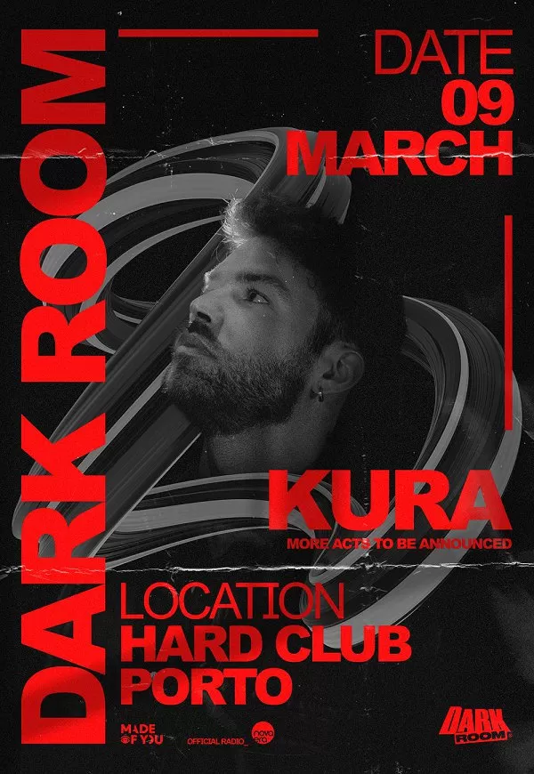 Dia 9 de março, o Hard Club recebe pela primeira vez, KURA presents DARKROOM! Um conceito virado para as sonoridades House, Tech House e Techno. Prepare-se para uma viagem sonora e visual, onde a energia do KURA e o talento dos convidados prometem uma experiência inesquecível!