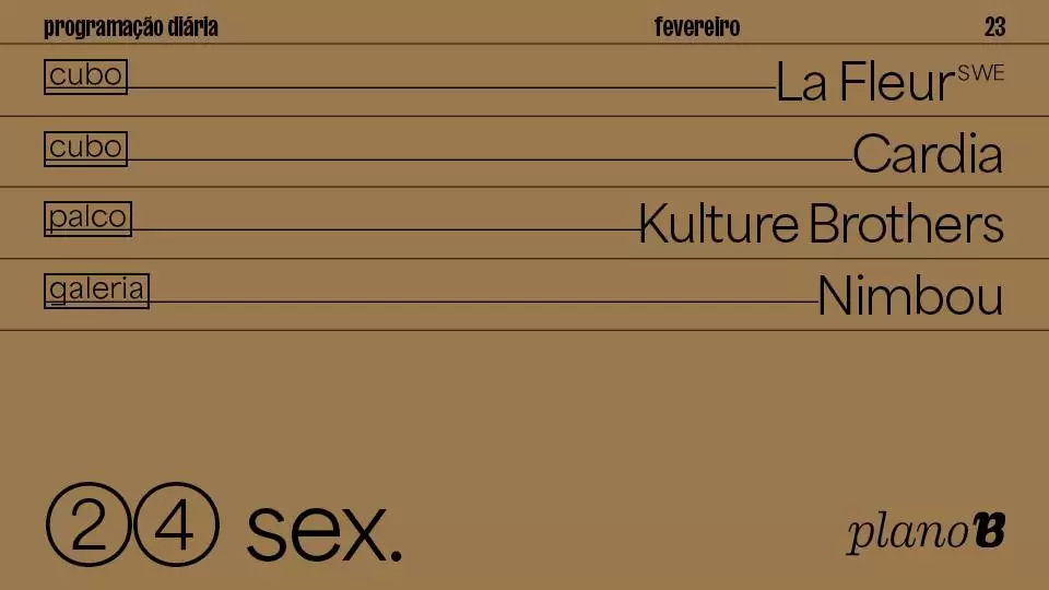 La Fleur, Cardia, Kulture Brothers, Nimbou La Fleur, Cardia, Kulture Brothers, Nimbou La Fleur, Cardia, Kulture Brothers, Nimbou Data 24 Fev 2023 Desde Hora 22:00 Localização Plano B Rua Cândido dos Reis nº30 4050-150 Porto Website https://agendaculturalporto.org/agenda-plano-b-porto/ Categorias Clubbing | NightlifeConcertos / MúsicaEventos ao Fim de semana Share this event Newsletter Receba comodamente no seu Email os eventos mais relevantes da cidade do Porto. Deixe este campo vazio se for humano: