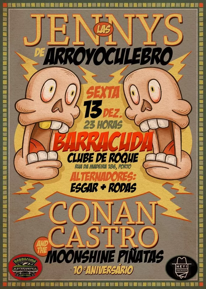 Uma noite de garage-punk-rock e puro brilli brilli interestelar para celebrar o 10º aniversário dos Conan Castro and The Moonshine Piñata! Com estreia absoluta em Portugal, as espanholas Las Jennys de Arroyoculebro prometem uma explosão sonora no Barracuda Clube de Roque.