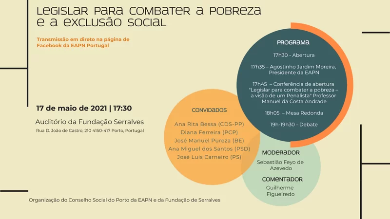 O Conselho Social do Porto da EAPN e a Fundação de Serralves uniram esforços para organizar esta presente conferência que, em tempos difíceis pelas causas da pandemia que nos vem assolando, assume um modelo híbrido com assistência presencial e a distância, e que reúne personalidades públicas relevantes do nosso sistema político: o Professor Manuel da Costa Andrade, que até muito recentemente exerceu a função de Presidente do Tribunal Constitucional; e cinco reconhecidos membros do nosso Parlamento, representando razoavelmente o espetro ideológico da nossa Democracia, que vêm exercendo funções de caris social reconhecido, as e os Deputados José Luis Carneiro (PS), Ana Miguel dos Santos (PSD), José Manuel Pureza (BE), Diana Ferreira (PCP) e Ana Rita Bessa (CDS-PP).