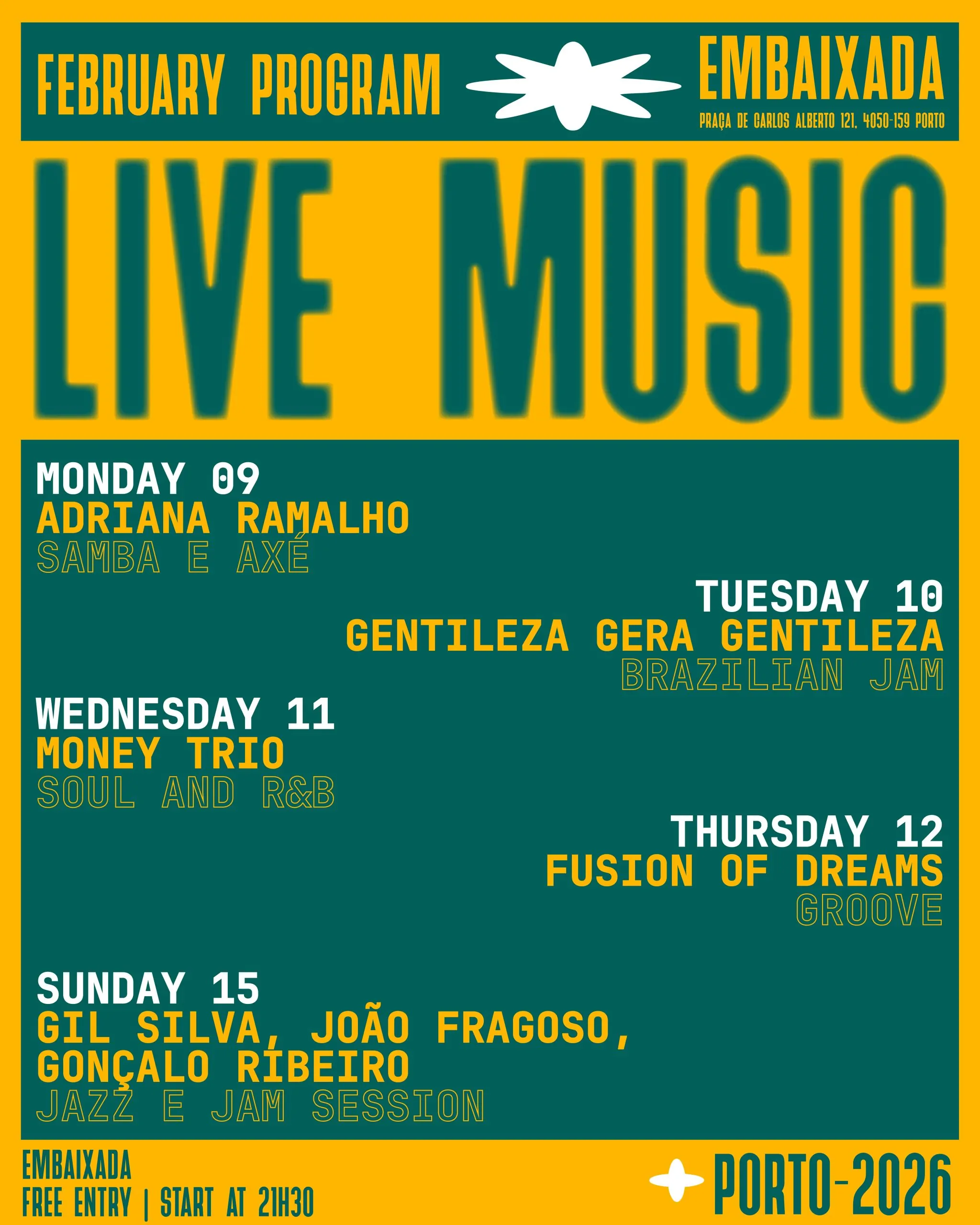 Live Music All week Live Music All week + Adicionar ao Google Calendar Data 10 Fev 2026 Hora 21:30 - 23:55 Localização Embaixada do Porto Praça de Carlos Alberto 121, 4050-526 Porto Categorias Concertos / Música Share this event Newsletter Receba comodamente no seu Email os eventos mais relevantes da cidade do Porto. Deixe este campo vazio se for humano: