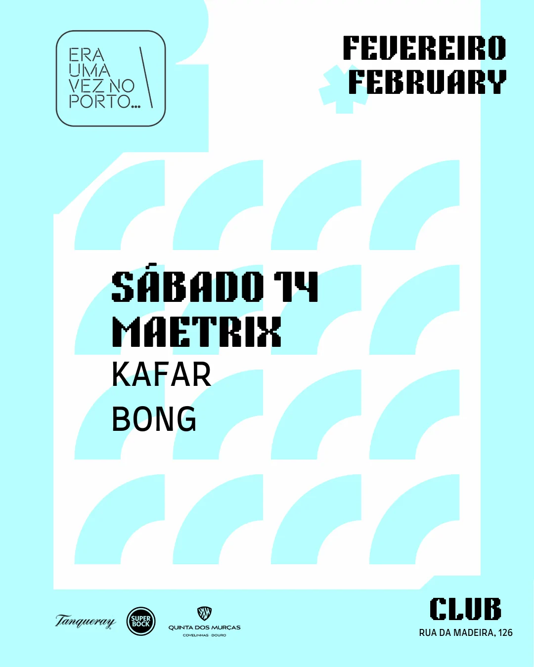 MÆTRIX … Sábado, 14|02|2026 MÆTRIX 23h59/6h 🎧 Kafar 🎧 Bong . . Data 14 - 15 Fev 2026 Desde Hora 23:55 - 6:00 Localização Era uma vez no Porto R. da Madeira 126, 4000-330 Porto Categorias Clubbing | NightlifeConcertos / MúsicaEnglish-Friendly EventsEventos ao Fim de semanaFestas e Arraiais Share this event Newsletter Receba comodamente no seu Email os eventos mais relevantes da cidade do Porto. Deixe este campo vazio se for humano: