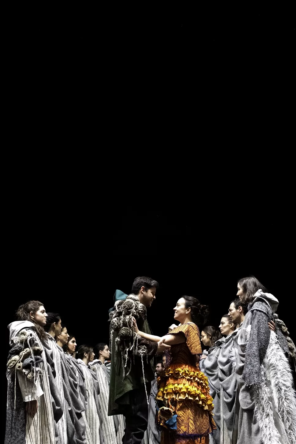 “Partimos da ideia de criar uma ópera sem cenografia, já que ia trazer outro tipo de custos que eram difíceis de suportar. E, particularmente, agrada-me criar a partir da simplicidade, ou encontrar simplicidade no que aparentemente pode ser complicado”, refere o encenador Ángel Fragua, que, pela primeira vez, encenou uma ópera. Para criar este “cenário vivo”, os figurinos criados por Cláudia Ribeiro foram fundamentais, assim como o jogo de luzes, concebido por Pedro Pires Cabral. O coro assumiu o papel de várias personagens como a montanha, o rebanho de ovelhas e a vinha onde se faz a apanha da uva. No fundo, todos os elementos que representam o “Reino maravilhoso”: árvores, montanhas, rochas e animais.