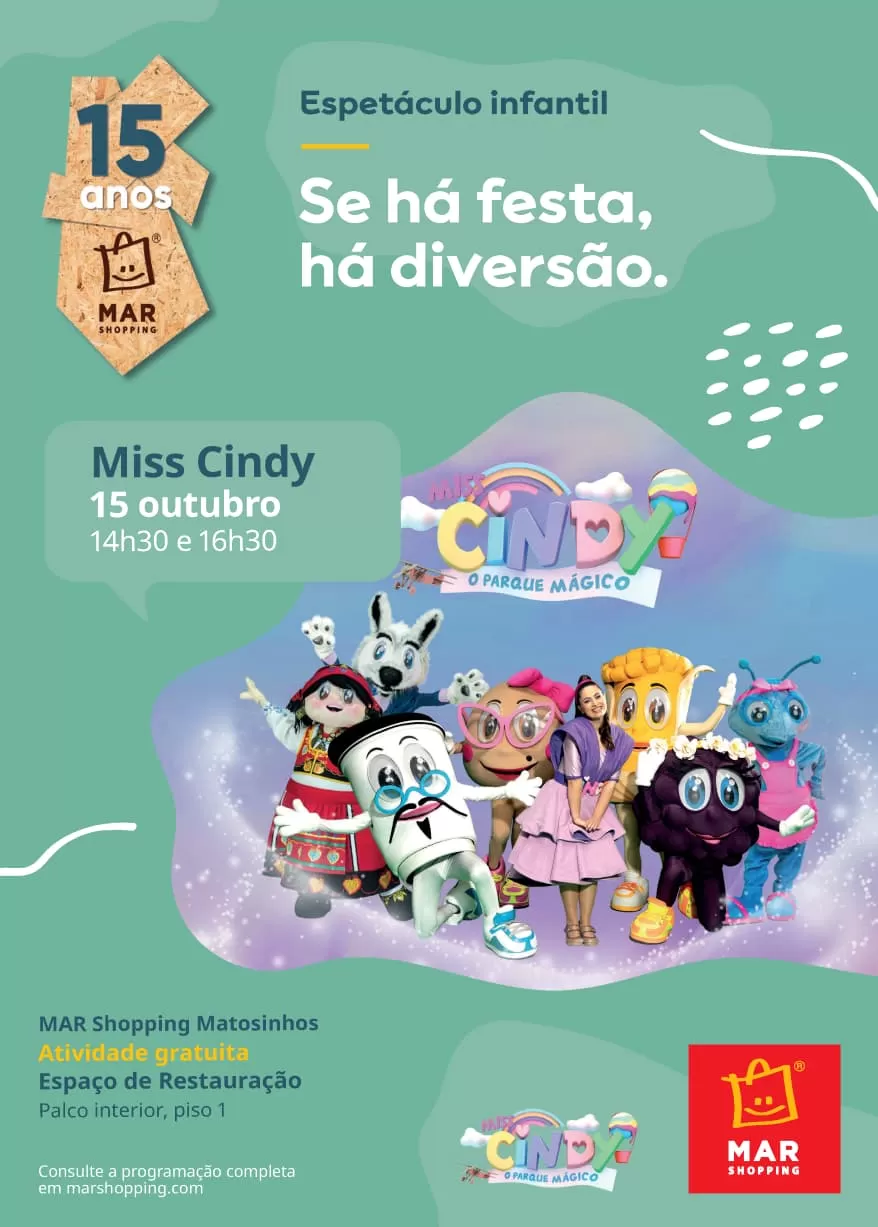 O MAR Shopping Matosinhos completa 15 anos em outubro e, nas semanas em que comemora o seu aniversário, irá oferecer àqueles com que tem vindo a colecionar memórias e experiências, uma programação gratuita a pensar em toda a família. Para as crianças, estão agendados dois espetáculos infantis. “Miss Cindy” irá animar as tardes de domingo de 15 de outubro. Em sessões duplas, às 14h30 e às 16h30, o palco do espaço de restauração será ocupado de cor e muita música.