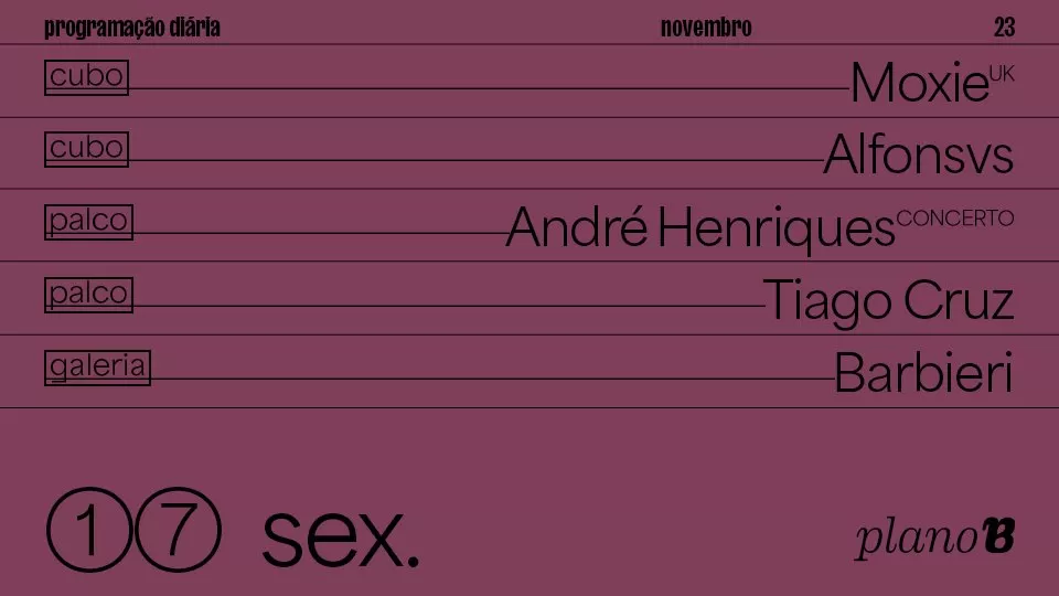 Moxie, Alfonsvs, André Henriques, Tiago Cruz, Barbieri – Plano B 17 SEXTA-FEIRA, 17 DE NOVEMBRO DE 2023 ÀS 22:00 Moxie, Alfonsvs, André Henriques, Tiago Cruz, Barbieri Plano B Data 17 Nov 2023 Desde Hora 22:00 Localização Plano B Rua Cândido dos Reis nº30 4050-150 Porto Website https://agendaculturalporto.org/agenda-plano-b-porto/ Categorias Clubbing | NightlifeConcertos / MúsicaEventos ao Fim de semana Share this event Newsletter Receba comodamente no seu Email os eventos mais relevantes da cidade do Porto. Deixe este campo vazio se for humano: