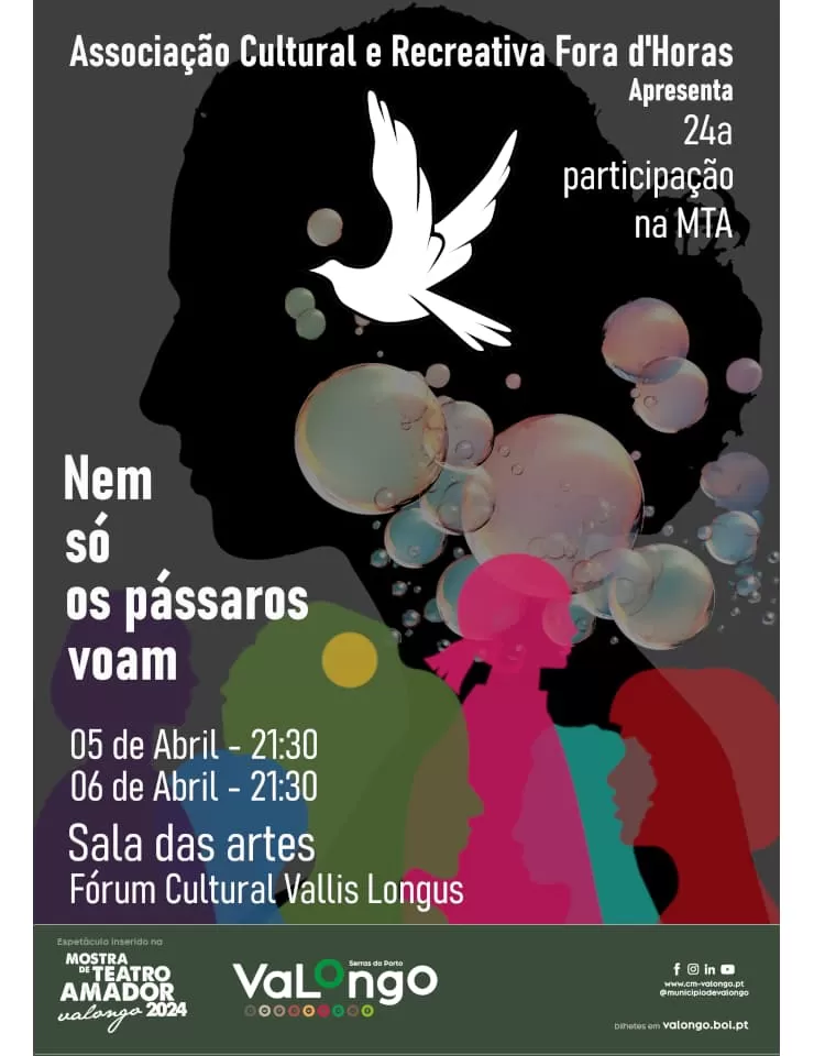 Título da peça: Nem só os Pássaros Voam |Título da obra original: Nem só os Pássaros Voam | Autor do texto original: O grupo (a partir de textos de Laura Ferreira e excertos de outros autores, entre os quais Manuel António Pina e Luísa Costa Gomes) |Tradutor: o grupo | Adaptador: Etelvina Baltazar e o grupo | Dramaturgia: Etelvina e Gisela Baltazar | Encenador: Gisela Baltazar, Luísa Ribeiro| Coreografia: Gisela Baltazar | Cenografia: Valdemar Baltasar, Tânia Seixas e o grupo | Figurinos/ Caracterização: Tânia Seixas e o grupo | Música: Gisela Baltazar (seleção de músicas) e José Luís Braga (na sonoplastia) | Luminotecnia: José Luís Braga / (assistente de luz e/ou som) Luísa Ribeiro | Elenco: Cátia Costa, Etelvina Baltasar, Fátima Nunes, Gisela Baltazar, Rosário Nascimento e Tiago Laranjeira.