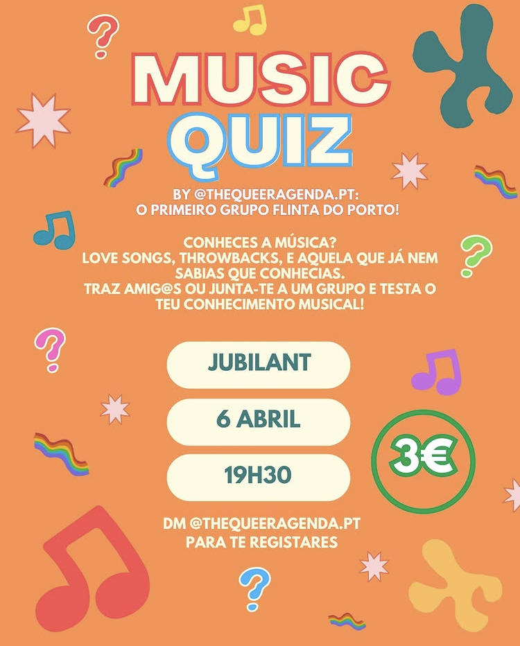 EN: Join us on April 6th at Espaço Cultural Jubilant for a Music Quiz, hosted by the lovely Andy (she/her)!
