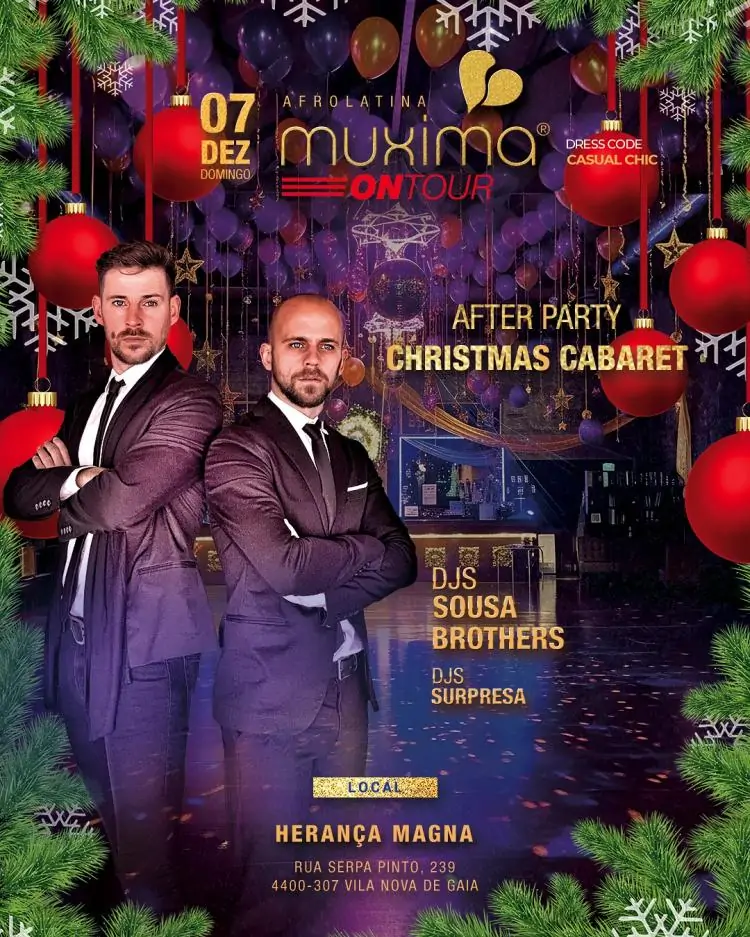 After party afrolatina com muita energia e ritmo, trazendo DJs Sousa Brothers e DJs surpresa. Uma noite para dançar, celebrar e entrar no espírito natalício com música contagiante e boa vibração.